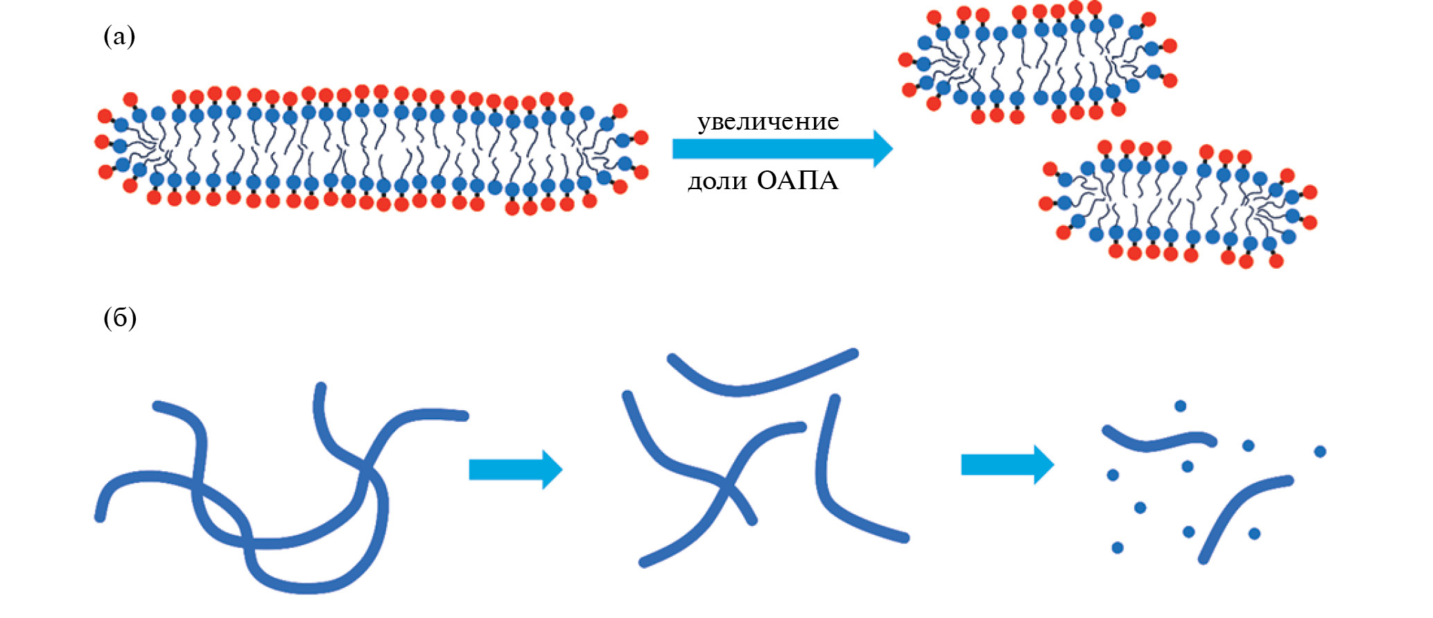 Рис. 6. (а) Схематическое изображение уменьшения длины и увеличения количества мицелл при замене части молекул цвиттерионного ПАВ ОАПБ на молекулы положительно заряженного ПАВ ОАПА; (б) схематическое изображение изменения структуры сетки в растворах при увеличении доли ОАПА.