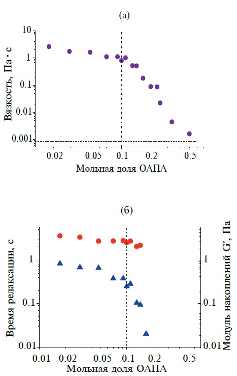 На рис. 5а, 5б представлены зависимости вязкости при нулевой скорости сдвига, значения модуля накопления при высоких частотах (при 10 рад/c) и терминального времени релаксации, определенного как обратная величина частоты, при которой G'=G" [33]. На зависимостях можно выделить 2 области: слабого падения реологических параметров и резкого падения вязкости и времени релаксации. В первой области (при мольной доле ОАПА до 0.1) вязкость падает лишь в 3 раза, время релаксации также падает в 3 раза, а значения модуля накопления практически не изменяются, что хорошо видно на рис. 3а. Постоянство модуля накопления указывает на неизменную плотность сетки зацеплений [3, 31], а изменение вязкости и времени релаксации можно объяснить уменьшением средней длины мицелл и одновременно увеличением их количества [34]. Причем длина мицелл уменьшается слабо, так как вязкость зависит от длины в третьей степени, как было указано выше. Ранее было найдено, что в случае достаточно плотной сетки зацеплений, когда средняя длина мицелл сильно превышает длину субцепей, значение модуля накопления не изменяется при уменьшении средней длины червеобразных мицелл [34]. Можно полагать, что это будет выполняться до тех пор, пока длина червеобразных мицелл не станет короче длины субцепей в сетке зацеплений [29].