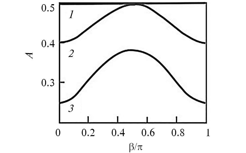 Отметим, что в отсутствие упругих эффектов (g = 0) параметр A равен ½ и не зависит от угла β между H и ν0, как это и должно быть из физических соображений. Кривые на рис. 3 симметричны относительно β = π/2.