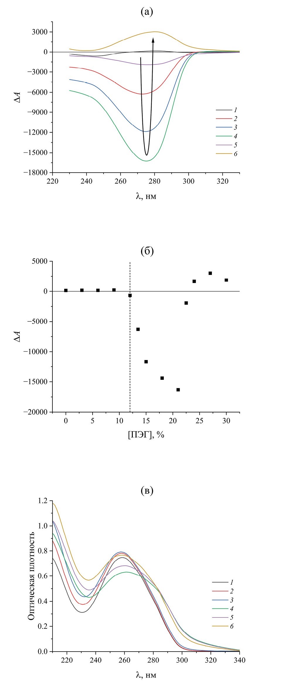 Рис. 4. (а) Спектры КД систем с различным содержанием ПЭГ (масc. %): 1 – 0, 2 – 13.5, 3 – 16.5, 4 – 21, 5 – 22.5, 6 – 27. (б) Зависимость амплитуды КД-сигнала от концентрации ПЭГ в системе. Стандартные отклонения, рассчитанные по трем независимым измерениям, не превышают 7%. (в) Спектры поглощения систем с различным содержанием ПЭГ (масc. %): 1 – 0, 2 – 6, 3 – 12, 4 – 18, 5 – 24, 6 – 30.