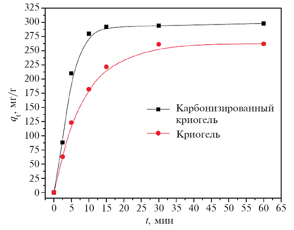 Эффективность процесса адсорбции может быть оценена путем анализа кинетики поглощения тяжелых металлов, в частности Pb2+, на карбонизированном криогеле, поскольку это помогает определить общее время процесса и, следовательно, применимость адсорбента в промышленном масштабе. На рис. 6 приведена экспериментальная кривая кинетики сорбции ионов свинца на исходном криогеле и для его карбонизированной формы.