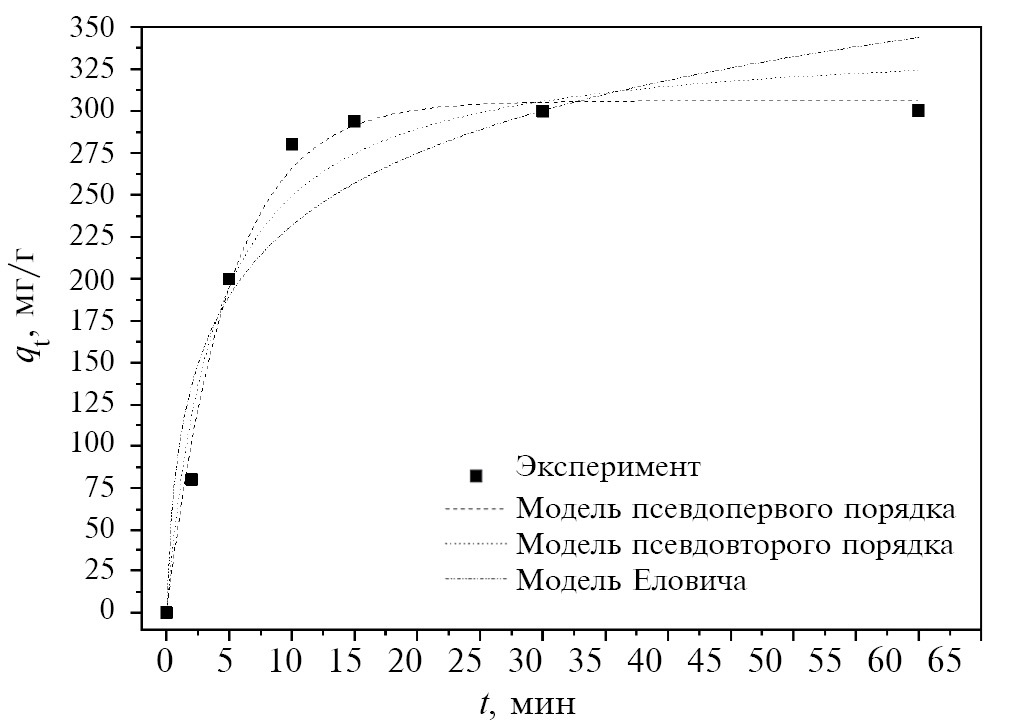 Кинетические экспериментальные данные были обработаны в координатах выбранных моделей с помощью программного продукта OriginPro. Для определения коэффициентов уравнений и нахождения теоретических уравнений кинетики сорбции строили линеаризованные кривые в выбранных координатах. Соответствие между экспериментальными данными и теоретическими значениями выражали коэффициентом корреляции (R2). Кинетические кривые, данные которых рассчитаны по теоретическим уравнениям, построены наряду с экспериментальной кинетической зависимостью на рис. 7.