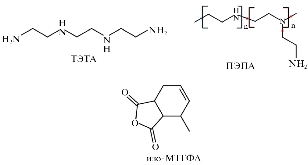 В качестве объектов исследования были выбраны различающиеся по химической природе, строению и структуре, аминные и ангидридный отвердители, используемые в различных режимах процессов отверждения эпоксидных олигомеров. Известные справочные данные этих систем приведены в табл. 1.