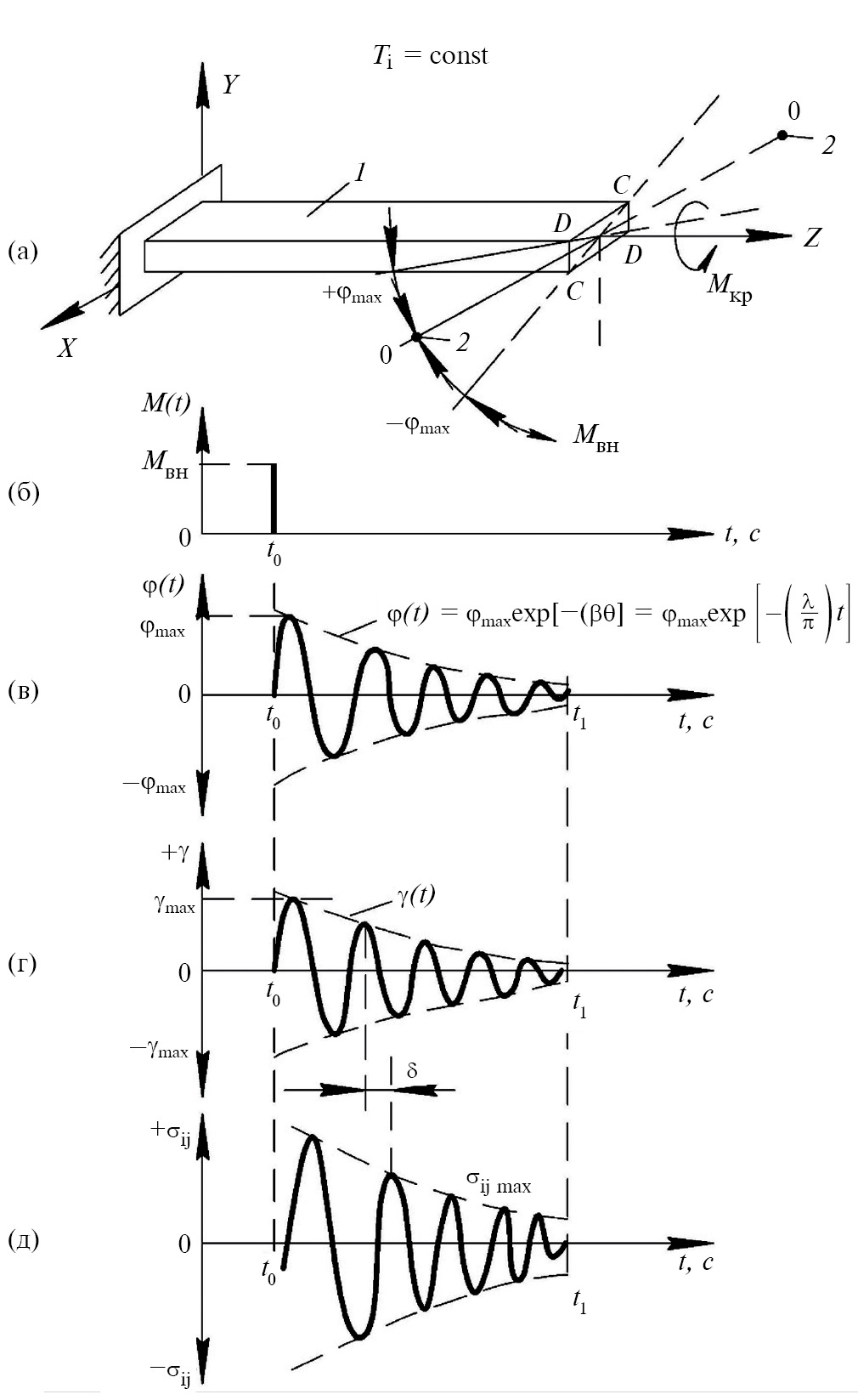Рис. 3. Эпюры свободно затухающего колебательного процесса, возбуждаемого в исследуемом образце – (а) в изотермическом режиме T = const импульсным воздействием – (б). Развертка временной зависимости угла закручивания φ(t) – (в) относительно продольной оси Z образца. Деформация, возникающая в образце – (г) и касательные напряжения σij – (д) [28, 32].