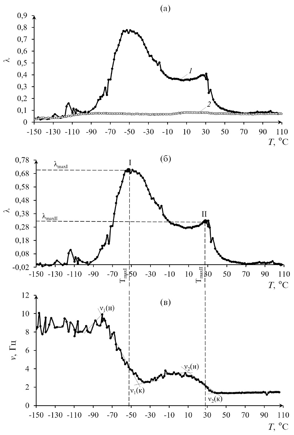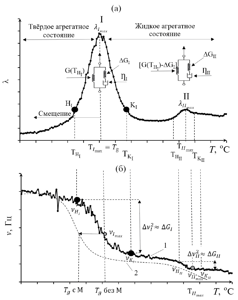Каждый пик диссипативных потерь λi представляет собой отображение совместной реакции на внешнее воздействие двух структурно-кинетических подсистем, в совокупности образующих исследуемую систему в целом [14]. Элементы одной структурно-кинетической подсистемы реагируют на внешнее воздействие в определенном интервале температур вязкоупруго, а элементы другой структурно-кинетической подсистемы реагируют на это же внешнее воздействие в этом интервале температур упруго [36].