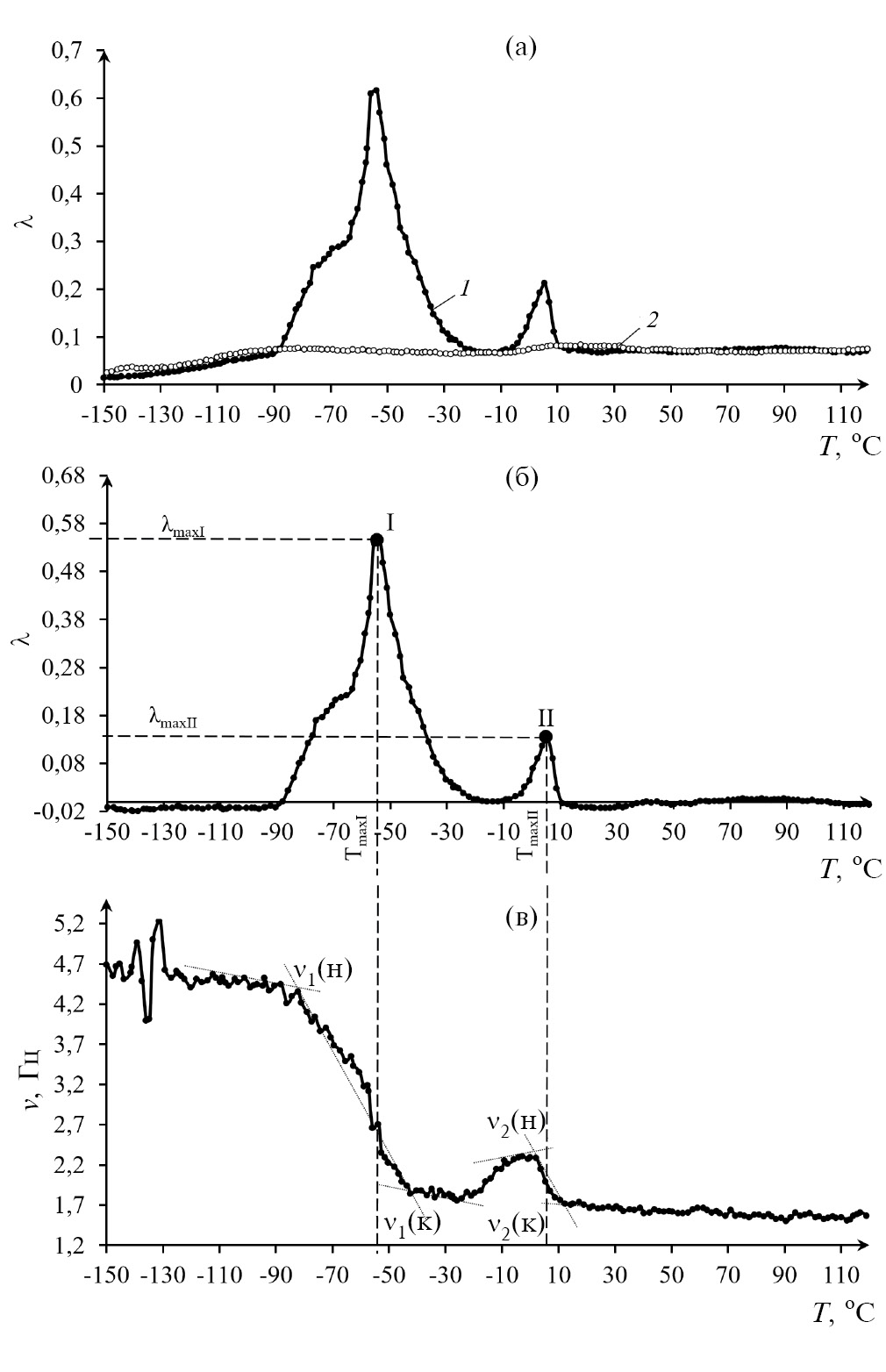 Рис. 4. Спектр внутреннего трения λ = f(T) композитной системы “ТЭТА–целлюлоза” (кривая 1) и целлюлозной подложки (кривая 2) – (а); спектр λ = f(T) этой же композитной системы “ТЭТА–целлюлоза” без диссипативных потерь, вносимых целлюлозной подложкой – (б); температурная зависимость частоты ν = f(T) в композитной системе “ТЭТА–целлюлоза” – (в).