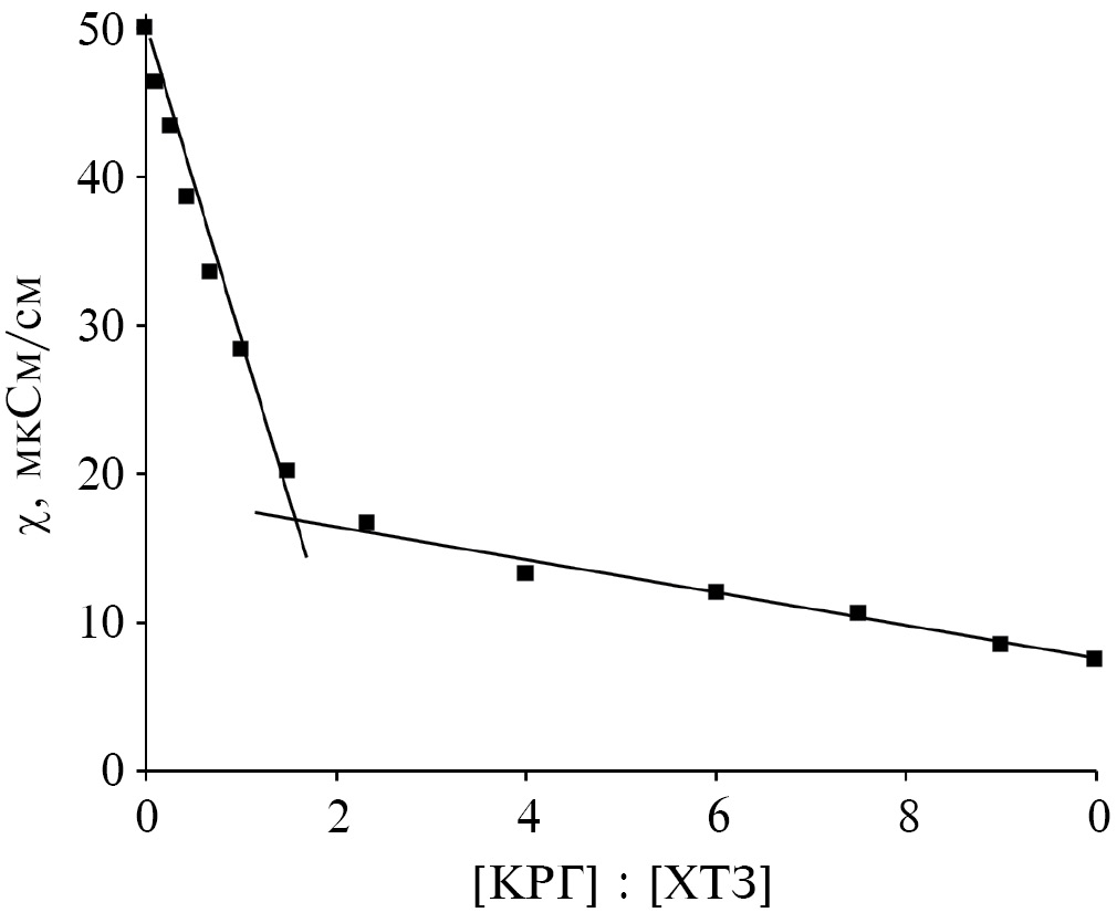 По изменению электропроводности смешанных растворов КРГ и ХТЗ судили о характере межмолекулярного взаимодействия полиэлектролитов (рис. 2). При смешении КРГ и ХТЗ наблюдается резкое уменьшение электропроводности растворов, что свидетельствует об электростатическом взаимодействии протонированных свободных аминогрупп ХТЗ и сульфатных групп КРГ. На изотерме электропроводности смесей полиионов имеется выраженный перегиб, указывающий на образование стехиометрического ПЭК с максимальным количеством ионных связей. В условияx проведения нашего эксперимента комплекс был обогащен звеньями каррагинана ([КРГ] : [ХТЗ] = 1.5).