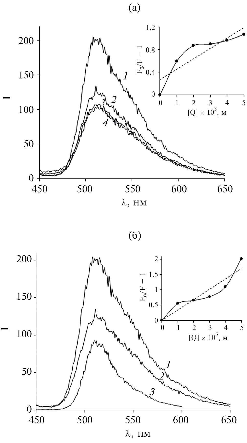 На следующей стадии работы изучалось тушение флуоресценции ФЛЦ в присутствии ХТЗ и ПЭК для нахождения констант связывания по уравнению Штерна – Фольмера (5). На рис. 6а представлены спектры флуоресценции раствора ФЛЦ (кривая 1) и растворов красителя постоянной концентрации с различными добавками ХТЗ (кривые 2–4) при рН 7.0. Раствор ФЛЦ обладает желто-зеленой люминесценцией, имеет эмиссию при 510 нм, что делает его хорошим наномаркером для визуализации процессов в организме человека. Форма спектров флуоресценции красителя и положение максимума не изменяются при введении ХТЗ. Однако отмечается снижение интенсивности флуоресценции ФЛЦ, что объясняется межмолекулярными взаимодействиями молекул красителя с макромолекулами ХТЗ. На рис. 6б в качестве примера приведено сравнение тушения флуоресценции ФЛЦ добавлением ХТЗ определенной концентрации и ПЭК КРГ–ХТЗ с такой же концентрацией ХТЗ. Как видно из рисунка, в присутствии комплекса наблюдается еще более интенсивное тушение флуоресценции красителя по сравнению с добавками ХТЗ.