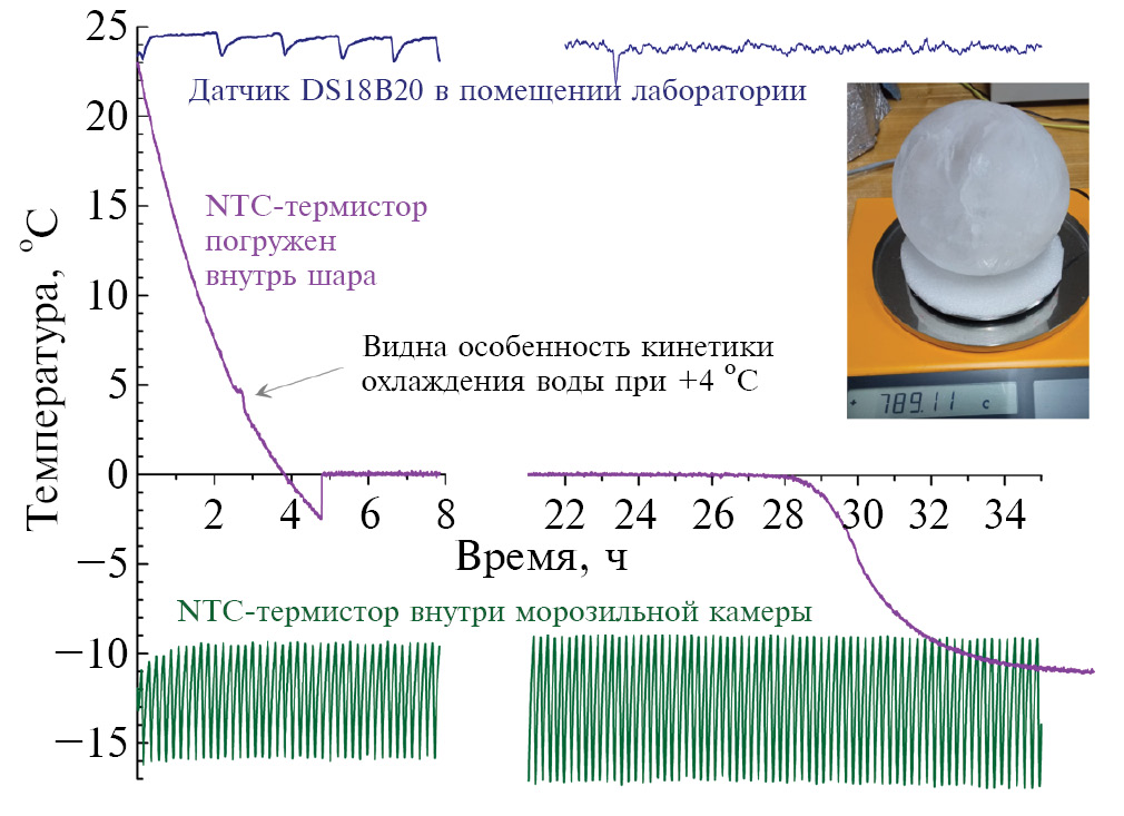 Рис. 1. Пример кинетики замораживания одного из пластиковых шаров, заполненных водой, в морозильной камере. Верхняя кривая показывает изменение температуры в лаборатории (после 15 часов измерений система климат-контроля была отключена), фиолетовая кривая – температура внутри шара, а нижняя осциллирующая зависимость – температура в воздушном пространстве морозильной камеры. Вблизи +4°C видна особенность в кинетике охлаждения, связанная с перестройкой структуры воды при прохождении точки максимальной плотности.