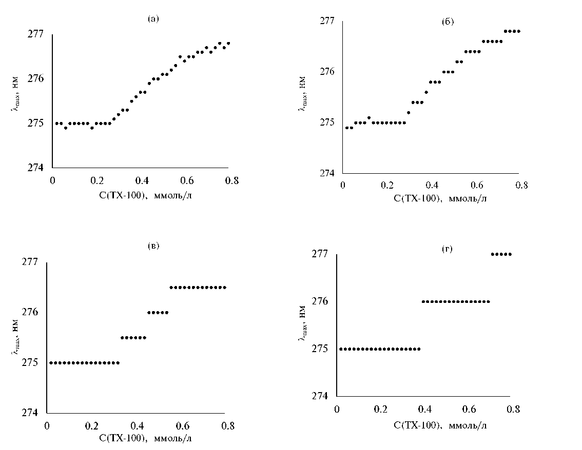 Отдельный интерес представляет прямое определение ККМ для растворов Тритонов спектроскопическими методами, как для веществ, обладающих собственным поглощением и способных к флуоресценции. Авторами [7] указывается, что прямую спектрофотометрию можно применять для определения ККМ по изменению наклона прямой зависимости поглощения при заданной длине волны от концентрации ПАВ в растворе. Некоторыми исследователями предпринимались попытки спектрофотометрического определения ККМ Тритонов [20, 21]. Так, при изучении светопоглощения водных растворов Tритона Х-100 в диапазоне концентраций 0.0428–0.6838 ммоль/л было установлено, что поглощение увеличивается немонотонно и характеризуется максимумом (λmax) при 277 ± 1 нм. При повышении концентрации нПАВ не наблюдали изменения кривой поглощения и смещения λmax, что не позволило определить точку перегиба [20].