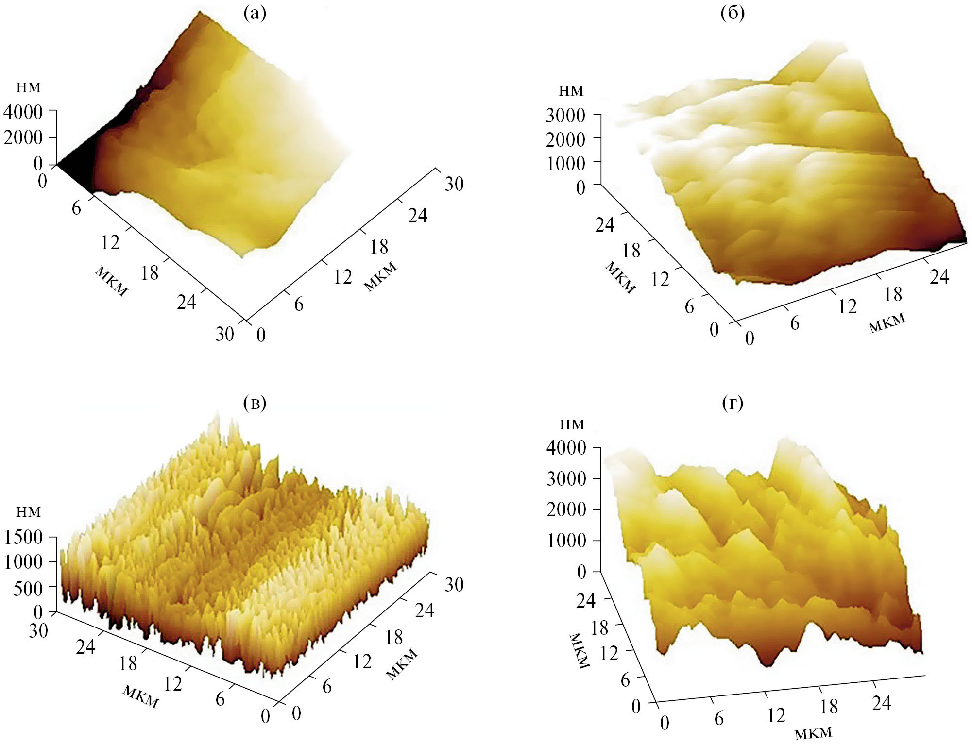 Рис. 2. Рельеф поверхности материала межфазных образований на основе стеарата иттербия (а, б) или ди-(2-этилгексил) фосфата иттербия (в, г), перенесенного на стеклянную пластинку, при наложении на систему механического воздействия (б, г) и его отсутствии (а, в). Система 0.10 М водный раствор YbCl3 / 0.05 М раствор стеариновой кислоты или Д2ЭГФК в гептане. Резонансная частота 6.6 кГц