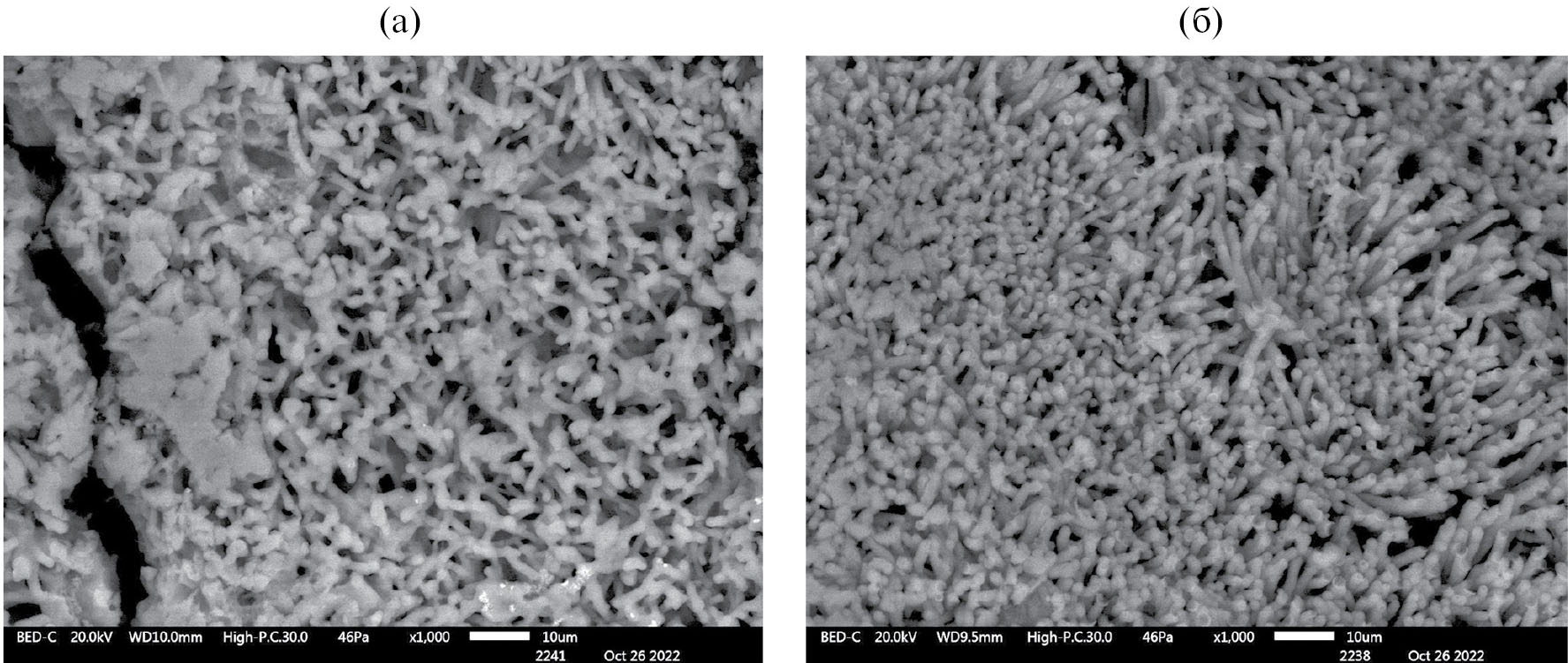 Рис. 3. СЭМ-изображения материала межфазных образований на основе ди-(2-этилгексил) фосфата иттербия, синтезированных при наложении механических колебаний (б) и их отсутствии (а). Система 0.10 М водный раствор YbCl3 / 0.05 М раствор Д2ЭГФК в гептане. Резонансная частота 6.6 кГц