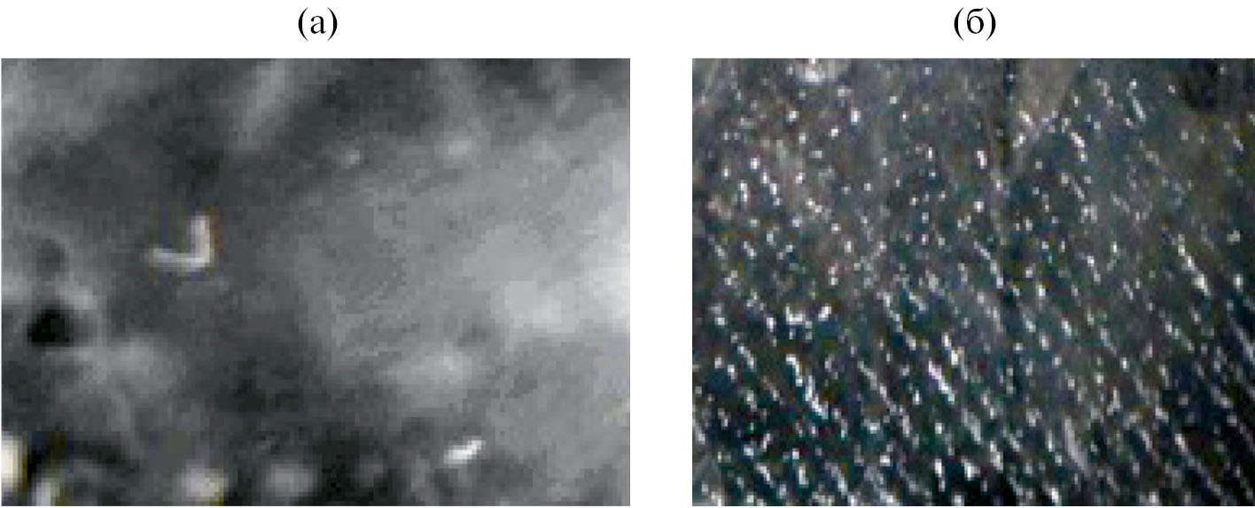 Рис. 4. Фотографические изображения материала межфазных образований на основе ди-(2-этилгексил) фосфата неодима, адгезированного к стеклянной пластинке, синтезированного при наложении на систему локального колебательного воздействия (б) и его отсутствии (а). Система 0.10 М водный раствор NdCl3 / 0.05 М раствор Д2ЭГФК в гептане. Резонансная частота 6.6 кГц