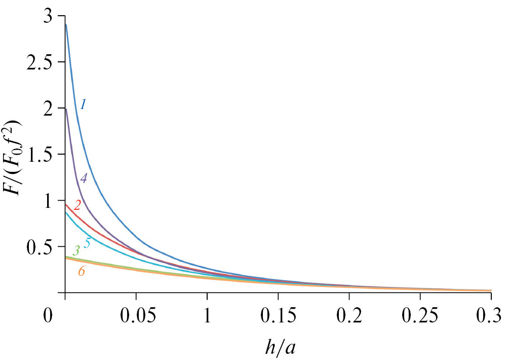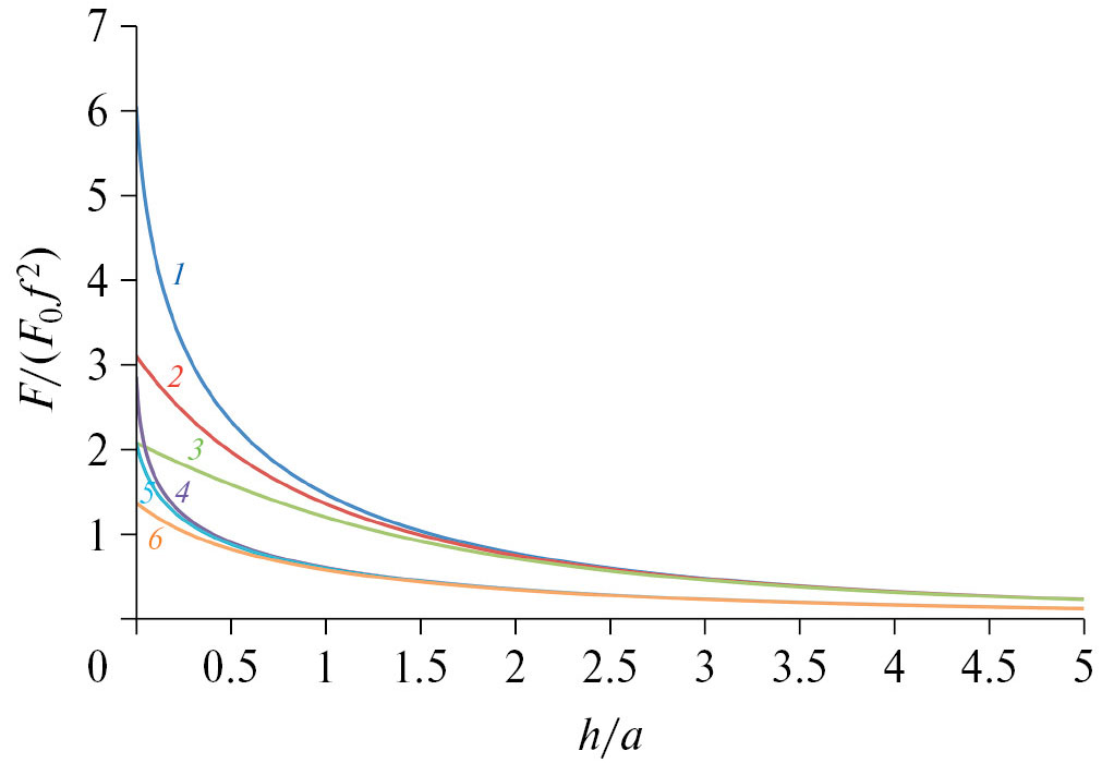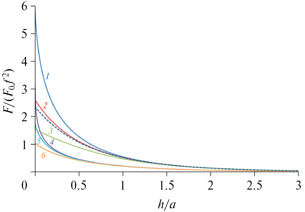 При этом расстояние, начиная с которого можно не учитывать зависимость сил от ε, уменьшается как с ростом f, так и с ростом k. Кроме того, как показывает сравнение кривых 3, 6 на рис. 4, при больших ε и k относительная разность между нормированными силами при разных f может уменьшаться с уменьшением расстояния между частицами. Например, при k = 10 и ε = 10, начиная с расстояния между частицами в два дебаевских радиуса экранирования, т. е. с h = 0.2a, разница между нормированными силами при f = 1 и f = 10 уменьшается с 9% до 5% при h = 0.01a. При превышении h = 0.2a эта разница медленно уменьшается с ростом h и при h = 1a составляет 8%. Об изменении зависимости нормированных сил от f при изменении ε и k при малых и больших h можно судить также по рис. 5–7.