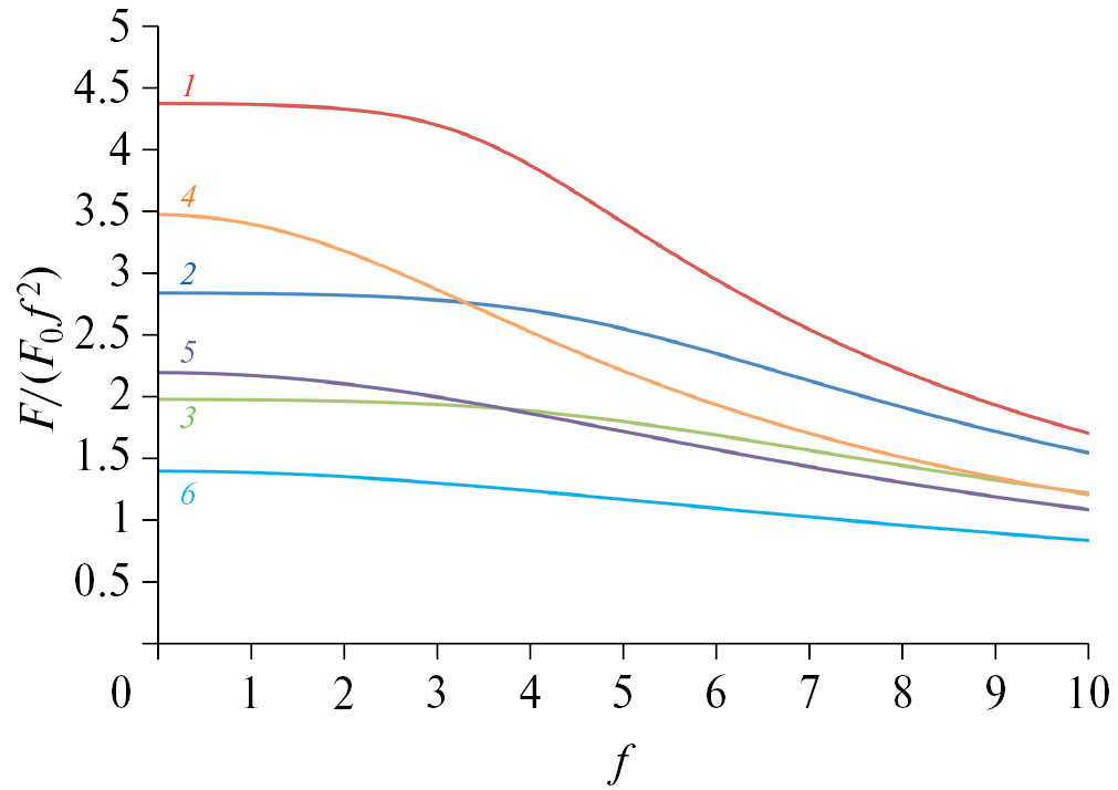 Рис. 5. Зависимость нормированной силы электростатического взаимодействия частиц от f при h/a = 0.1: 1 – k = 0.1, ε = 0.1; 2 – k = 0.1, ε = 1; 3 – k = 0.1, ε = 10; 4 – k = 1, ε = 0.1; 5 – k = 1, ε = 1; 6 – k = 1, ε = 10