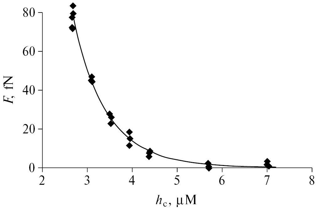 Рис. 8. Зависимость силы электростатического взаимодействия частиц от расстояния между центрами частиц при k = 0.59, f = 7.8, ε = 1.26. Ромбами представлены экспериментальные данные [20]