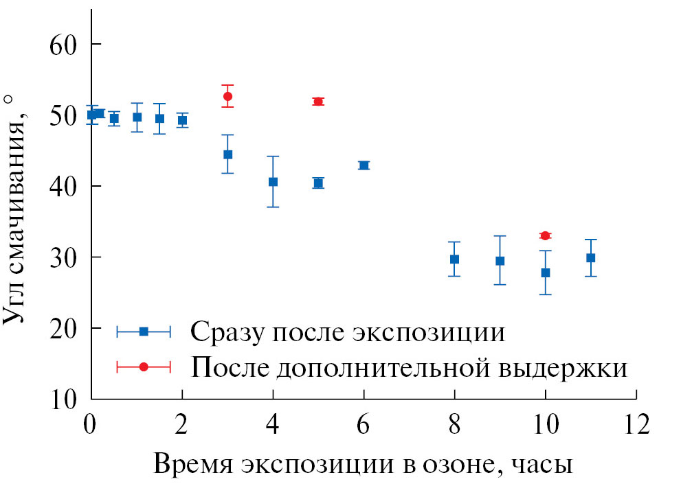 Для разделения вклада этих двух механизмов в повышение гидрофильности покрытия под действием озона, в ходе эксперимента, данные которого представлены на рис. 3, нами было исследовано изменение смачивания при длительном перерыве в контакте с обогащенной озоном атмосферой. На рис. 3 по оси абсцисс отложено время нахождения образца в атмосфере озона, синими символами показаны результаты измерения углов смачивания сразу после контакта с озоном, а красным – углы, измеренные после выдержки образца на воздухе под бумажным фильтром, после соответствующего периода контакта с озоном. Отметим, что бумажный фильтр защищает от адсорбции на поверхность углеводородных загрязнений из атмосферы, а длительная выдержка после контакта с озоном приводит к десорбции с поверхности и разложению озона. Анализ полученных данных показывает, что если после 180 и 300 минут экспозиции в озоне последующая выдержка образца на воздухе в течение 10–20 минут сопровождается восстановлением угла смачивания практически до начального значения, то после 600 минут суммарного контакта с озоном, самовосстановление смачивания происходит лишь частично. Такое поведение позволяет заключить, что гидрофилизация покрытия на начальных этапах контакта с озоном определяется, в основном, адсорбцией озона. Однако после длительной экспозиции в озоне основной вклад в снижение угла смачивания вносят уже разрушение и окисление пленки и подложки. Увеличение разброса углов смачивания и нарушение в ряде случаев осевой симметрии пузырька согласуются с представленной здесь интерпретацией механизмов воздействия озона. В то же время следует подчеркнуть, что при использованных больших временах экспозиции и очень больших концентрациях озона эффект деградации пленки не очень значительный. При этом он способствует гидрофилизации пленки, что улучшает ее противокоронные свойства.