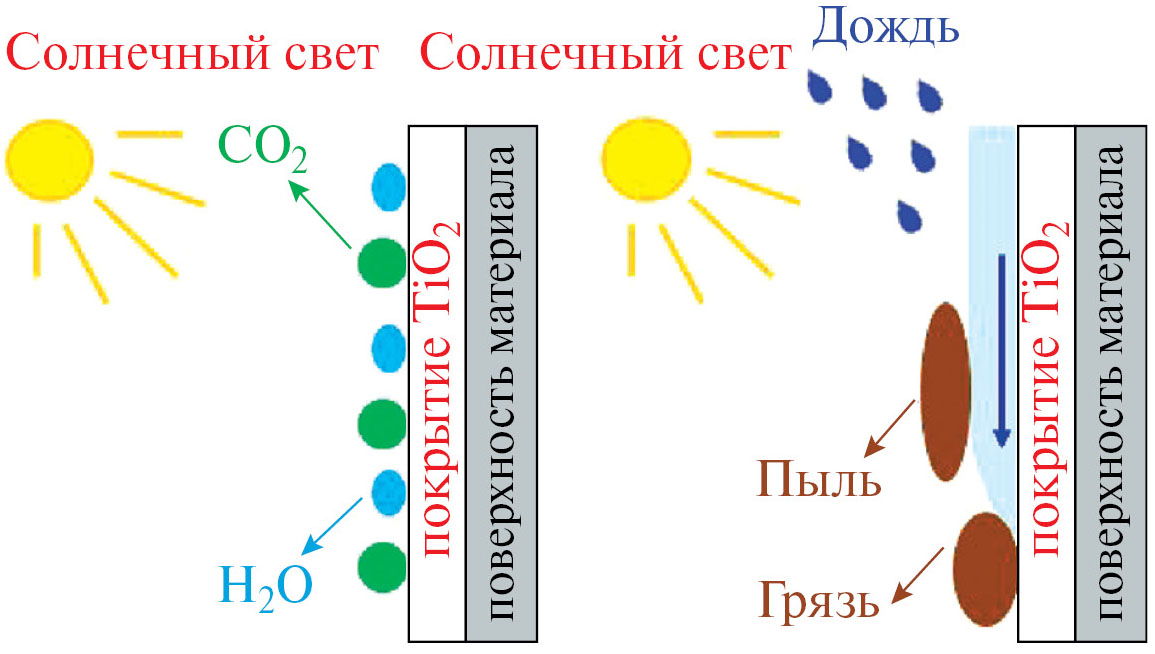 Под действием света фотокатализатор разлагает органические загрязнения, адсорбированные на его поверхности из окружающего воздуха, с образованием углекислого газа и воды. Также при действии света на фотоактивный материал его поверхность переходит в супергидрофильное состояние, и дождевая вода очищает ее от остатков органических загрязнений и пыли, “смывая” их по высоко-гидратированной поверхности покрытия.