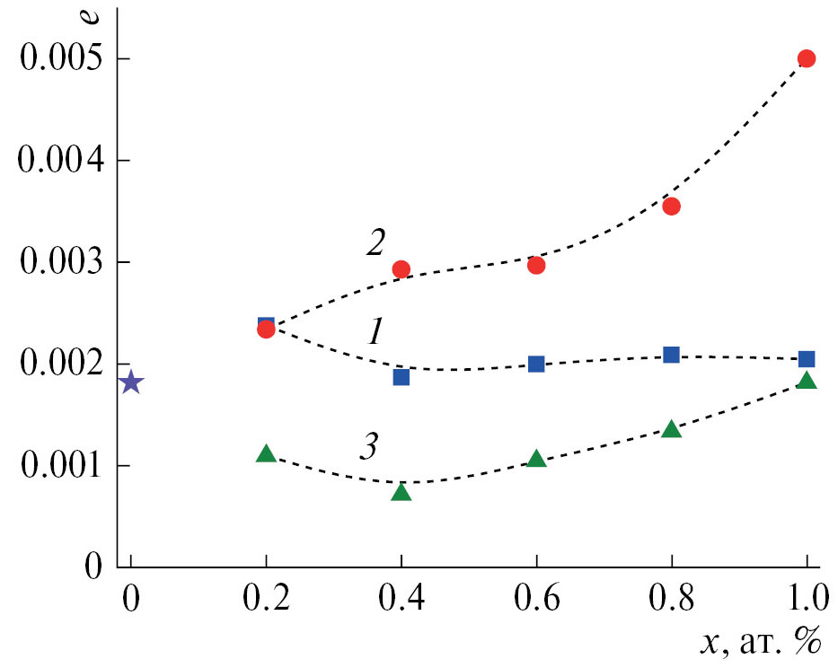 Рис. 2. Зависимость микронапряжения (е) от концентрации допанта (х) для серий покрытий x-Nb-TiO2 (1), x-Sc-TiO2 (2) и x-Al-TiO2 (3). Символ “звездочка” указывает значение для покрытия недопированного диоксида титана