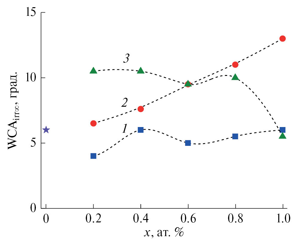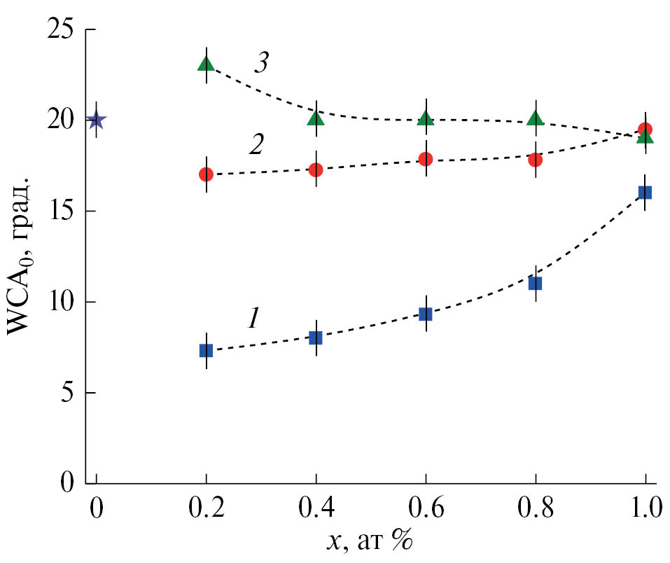 4. Fig. 3. Dependence of the initial angle of surface wettability with water (WCA0) on the dopant concentration (x) for x-Nb-TiO2 (1), x-Sc-TiO2 (2) and x-Al-TiO2 (3) coating series. The asterisk symbol indicates the value for the undoped titanium dioxide coating. The contact angle measurement error is marked with vertical dashes