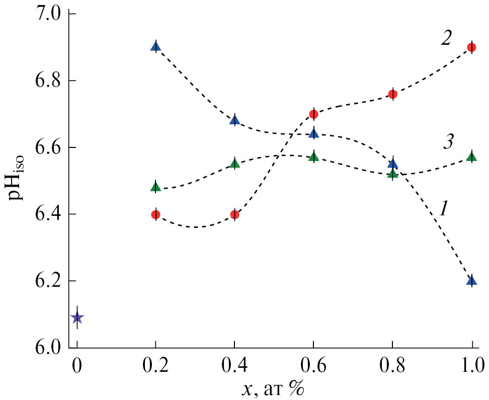 5. Fig. 4. Dependence of pH isoelectric point (pHiso) on dopant concentration (x) for titanium dioxide films doped with niobium (1), scandium (2) and aluminium (3). The symbol ‘asterisk’ indicates the pHiso value for the undoped titanium dioxide coating. The pH measurement error is indicated by vertical dashes