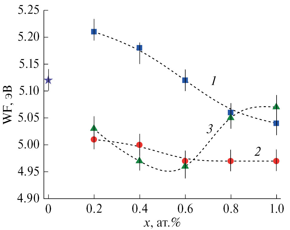 6. Fig. 5. Dependence of the electron yield work (WF) on the dopant concentration (x) for titanium dioxide samples doped with niobium (1), scandium (2) and aluminium (3). The symbol ‘asterisk’ indicates the value for undoped titanium dioxide. The measurement error of WF is marked with vertical dashes