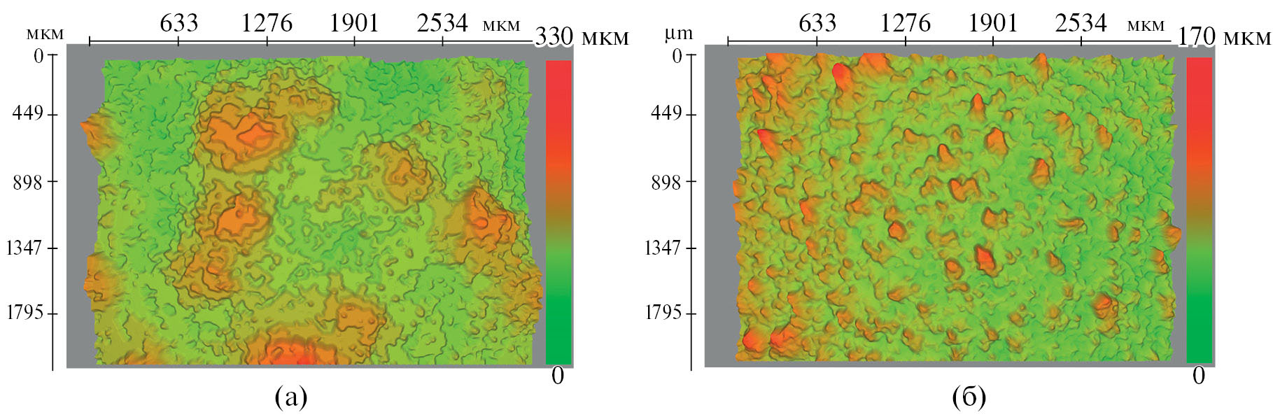 На рис. 2а и б приведены оптические изображения (карты высот), визуально отображающие морфологию поверхности покрытий, полученных при двух выбранных режимах напыления. Четко видно, что покрытия, полученные при различных параметрах напыления, имеют различную морфологию. На карте высот образца, полученного при самой низкой скорости прохода (рис. 2а), видно наличие неровностей поверхности с диаметром 200–700 мкм и высотой 150–330 мкм (относительно минимальной высоты поверхности покрытия) в конкретных точках, что связано с концентрацией кинетической энергии в данных точках. В свою очередь, на карте высот образца, полученного при самой высокой скорости прохода (рис. 2б) и одинаковом с предыдущим образцом расстоянии напыления, видно равномерное распределение неровностей поверхности по площади образца, что связано с отсутствием концентрации энергии в точке при большом расстоянии напыления. Как следствие, кинетическая энергия квазиравномерно распределяется между частицами порошка в процессе напыления, что привело к более сглаженному рельефу поверхности покрытия, полученного при более высокой скорости.