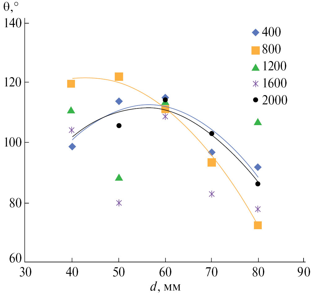 Установлено, что экспериментальные зависимости краевого угла θ от дистанции напыления d при определенных скоростях прохода детонационной пушки хорошо аппроксимируются параболическим уравнением:
