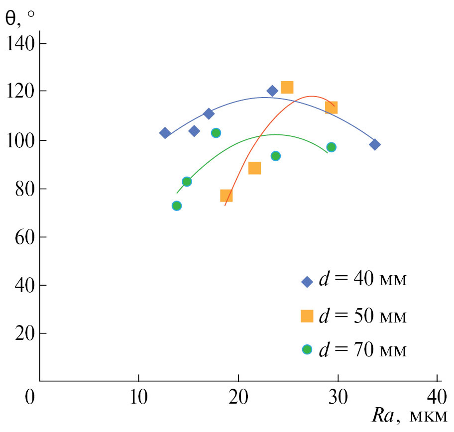 Рис. 6. Взаимосвязь краевого угла θ (°) и шероховатости Ra (мкм)