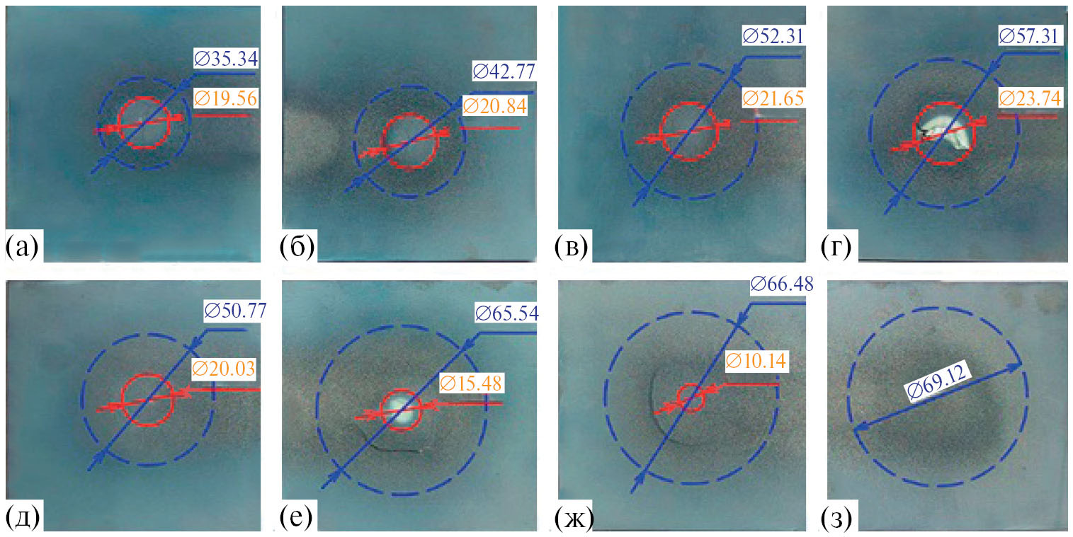 Рис. 8. Образцы пятен покрытия, полученных детонационным напылением порошка титана на разных расстояниях от сопла (мм): 20 (a), 40 (б), 60 (в), 80 (г), 100 (д), 130 (е), 160 (ж), 200 (з)