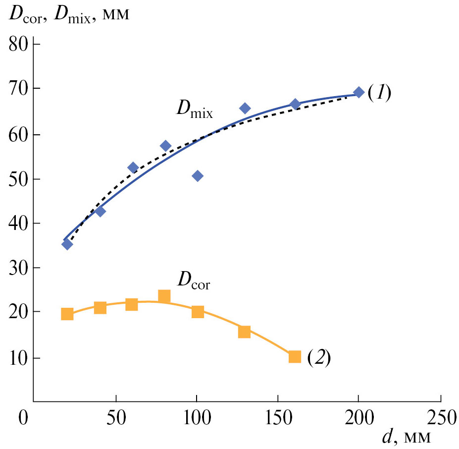 Результаты дополнительной серии экспериментов показали, что характерные диаметры пятен ядра потока Dcor и зоны смешивания Dmix по-разному зависят от дистанции напыления d. В частности, диаметр зоны пятна смешивания (1 на рис. 9) монотонно увеличивается с замедлением при напылении на более длинных дистанциях, в то время как диаметр пятен ядра потока (2 на рис. 9) сначала немного возрастает от 19.56 мм до максимального значения 23.74 мм при выборе дистанции напыления 80 мм. Затем он начинает относительно быстро снижаться до своего минимального значения при дальнейшем увеличении дистанции напыления.
