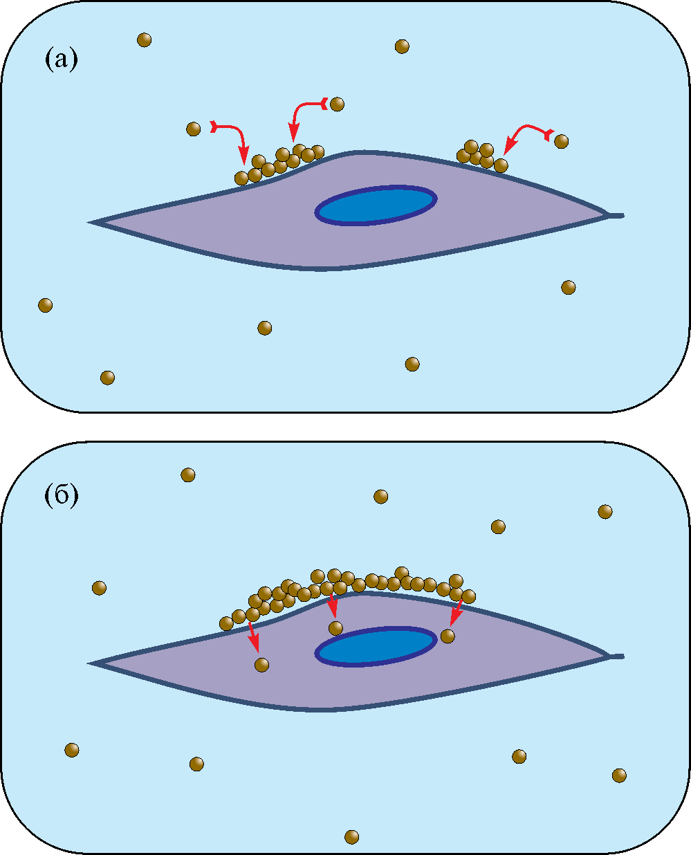 Рис. 8. Схема, иллюстрирующая процесс взаимодействия МНЧ, добавленных в питательную среду, и клеточной культуры. (а) коагуляция МНЧ вблизи клеточной мембраны; (б) интернализация адсорбированных МНЧ сквозь мембрану клетки в цитоплазму.