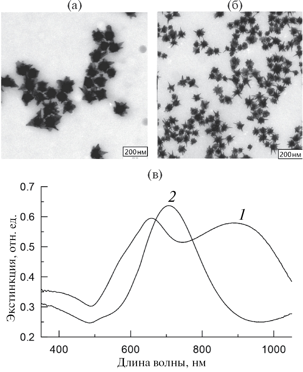 Рис. 1. Электронно-микроскопические изображения золотых нанозвезд, полученных восстановлением ЗХВК на поверхности 15 нм «зародышей» диметилформамидом (а) и аскорбиновой кислотой (б). Размерная шкала равна 200 нм. Панель (в) показывает спектры экстинкции синтезированных наночастиц. Спектр 1 – для нанозвезд на панели (а), спектр 2 – для нанозвезд на панели (б).