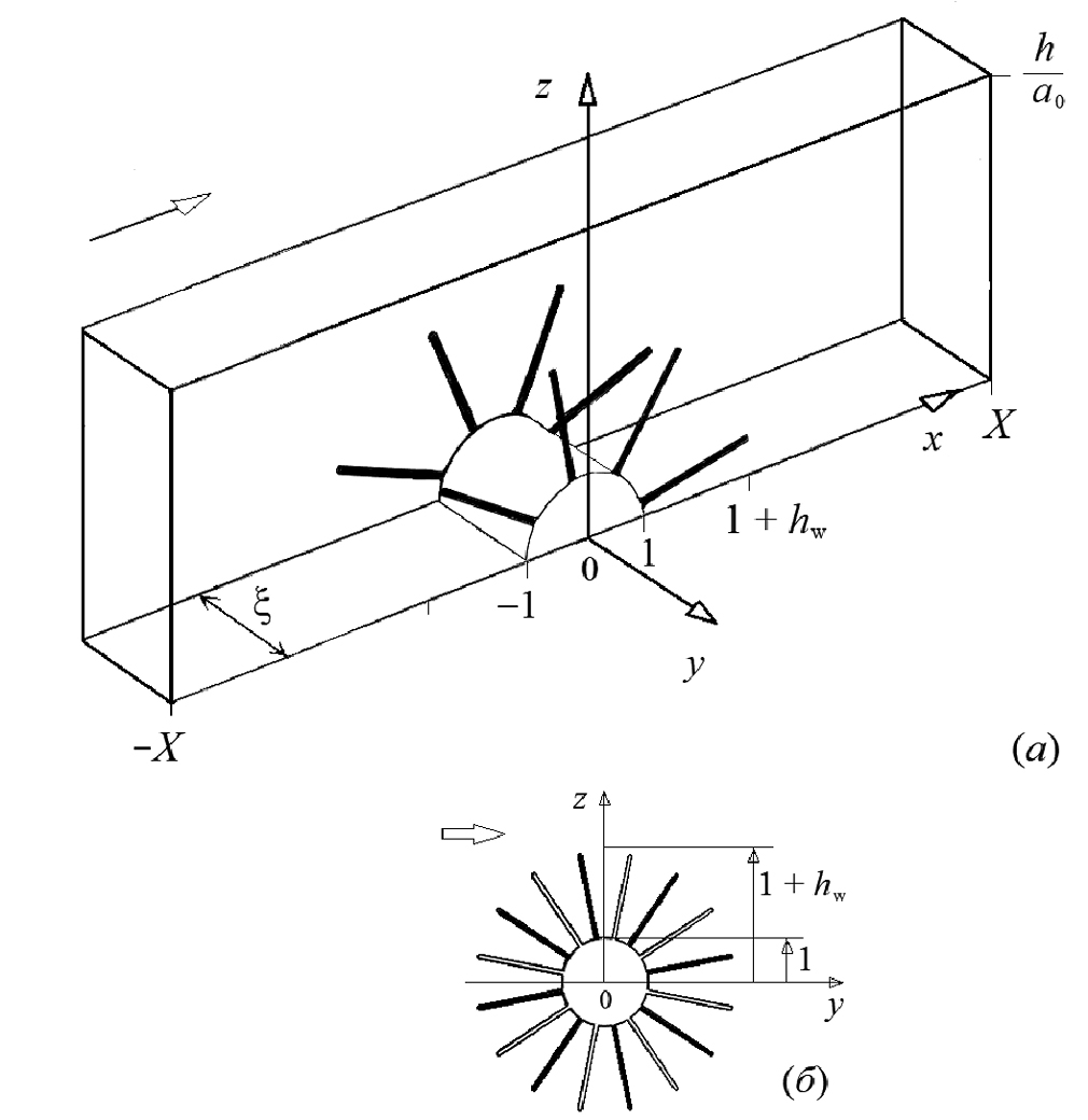 Поля скоростей и концентрации при обтекании ряда волокон с радиальными цилиндрическими иголочками находились в расчетной ячейке, показанной на рис. 1, численным решением безразмерных стационарных уравнений Стокса [12]: