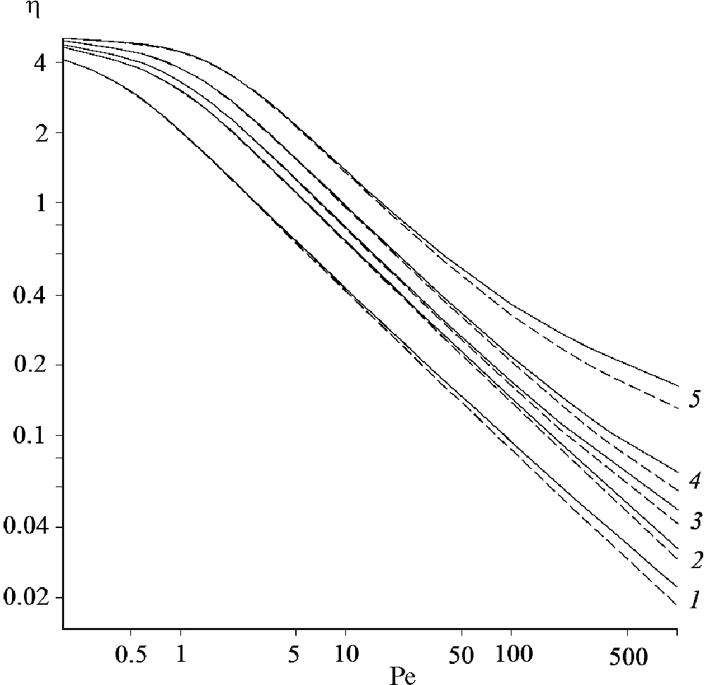 Рис. 6. Зависимости диффузионного коэффициента захвата точечных частиц волокном с «шубой» из иголочек с учетом эффекта скольжения газа (сплошные линии) и без учета (пунктирные) от числа Пекле, где hw = 0 (1), 0.1 (2), 0.5 (3), 1 (4), 2 (5): a0 = 1.5 мкм, aw = 0.025, Kn = 0.043 (λ = 0.065 мкм), ξ = 0.2, N = 8, b = 0.2, U = 10 см/с.