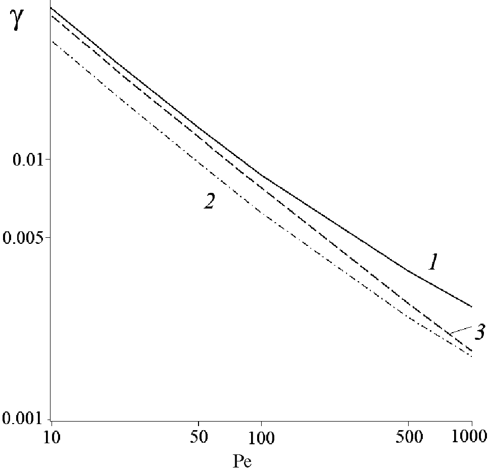 Рис. 7. Критерий качества фильтра γ = γ∗/2a0 из волокон с иголочками с длиной hw = 0.5 в зависимости от числа Пекле: 1 – прямое моделирование с учетом скольжения газа при Kn = 0.043, 2 – Kn = 0, 3 – волокно без «шубы» нановискеров. Остальные параметры те же, что на рис. 6.