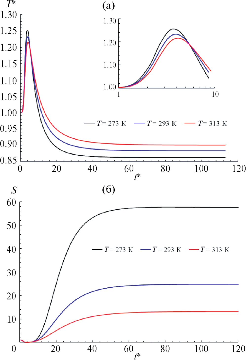 На рис. 5 показаны зависимости температуры и степени пересыщения от времени при x* = 5 для воды при различных начальных температурах и Тhot/ Тcold = 1.1. Видно, что с понижением начальной температуры степень пересыщения пара увеличивается. Вместе с очевидным выводом о росте степени пересыщения с увеличением значения Тhot/Тcold это позволяет сделать следующий вывод: для каждой начальной температуры существует минимальное значение Тhot/Тcold, которое обеспечивает пересыщение, достаточное для интенсивного образования зародышей.