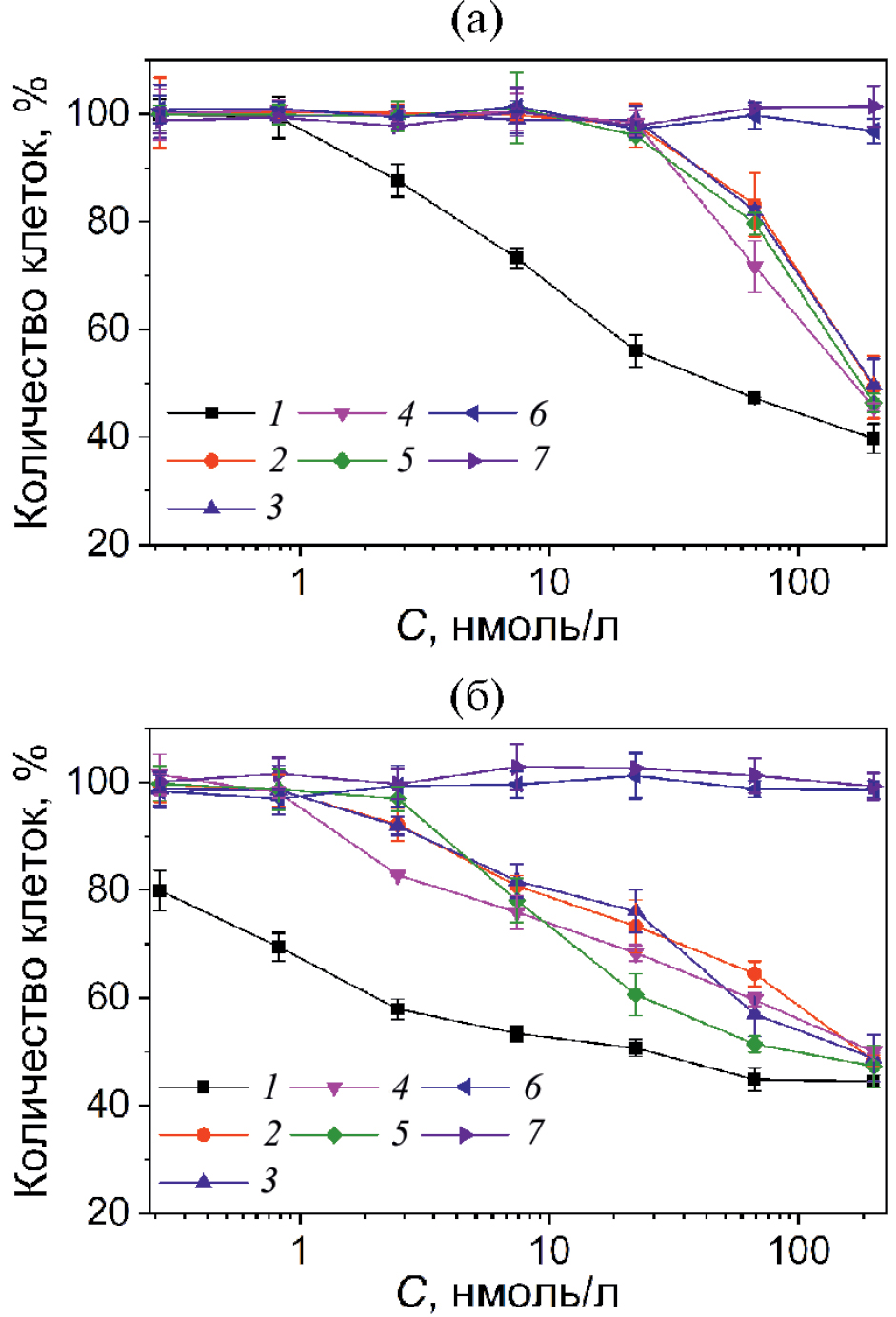 Рис. 5. Цитотоксический эффект на клеточных линиях (а) CT26 и (б) WI-38 для: 1 – свободного ДОЦ, 2 – ДОЦ-содержащих ПЛГА-Bi наночастиц, полученных при СПВС/вода = 1 мг/мл, 3 – ДОЦ-содержащих ПЛГА-Bi наночастиц, полученных при СПВС/вода =5 мг/мл, 4 – ДОЦ-содержащих ПЛГА-Bi наночастиц, полученных при СПВС/вода = 10 мг/мл, 5 – ДОЦ-содержащих ПЛГА-Bi наночастиц, полученных при СПВС/вода = 15 мг/мл, 6 – ненагруженных ПВС-стабилизированных ПЛГА-Bi наночастиц (CПВС/вода = 5 мг/мл), 7 – ненагруженных ПЛГА-Bi наночастиц, полученных без ПВС.