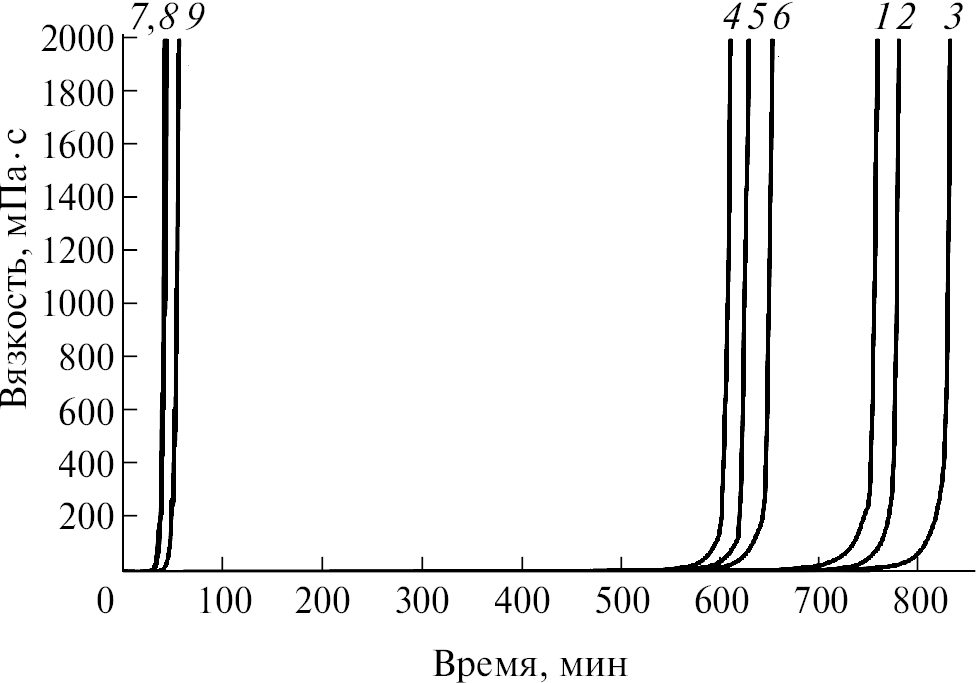 Время гелеобразования, мин | 630 | 753 | 776 | 827 | 678 | 605 | 623 | 648 | 732 | 40 | 41 | 52 |