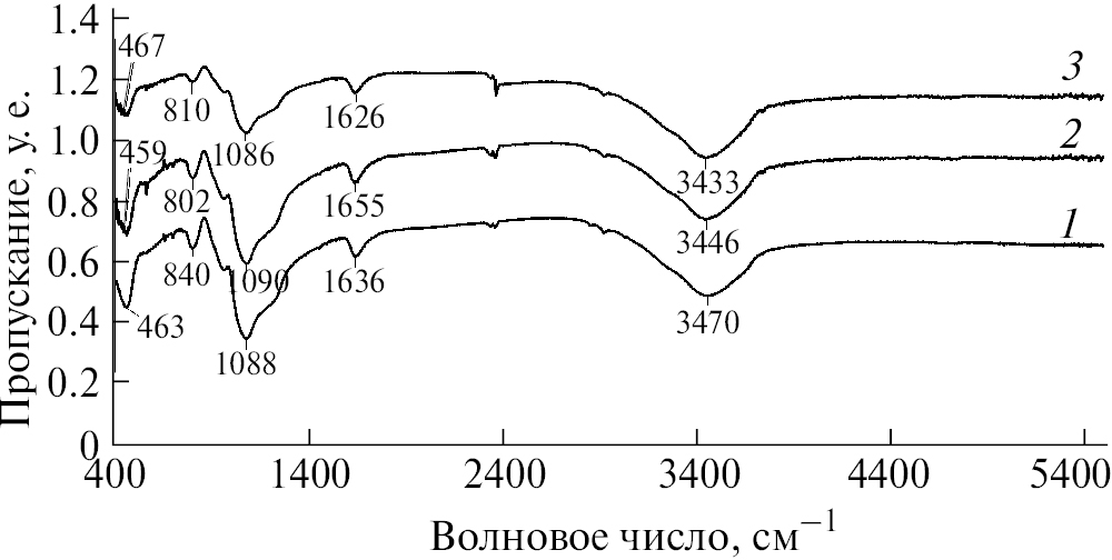 Все синтезированные образцы были проанализированы методом ИК-спектроскопии с Фурье-преобразованием. ИК-спектры пропускания регистрировали на ИК-Фурье-спектрометре ФСМ 2201. Образцы готовили прессованием смеси бромида калия с кремнеземом в соотношении 1 : 0.04 соответственно.