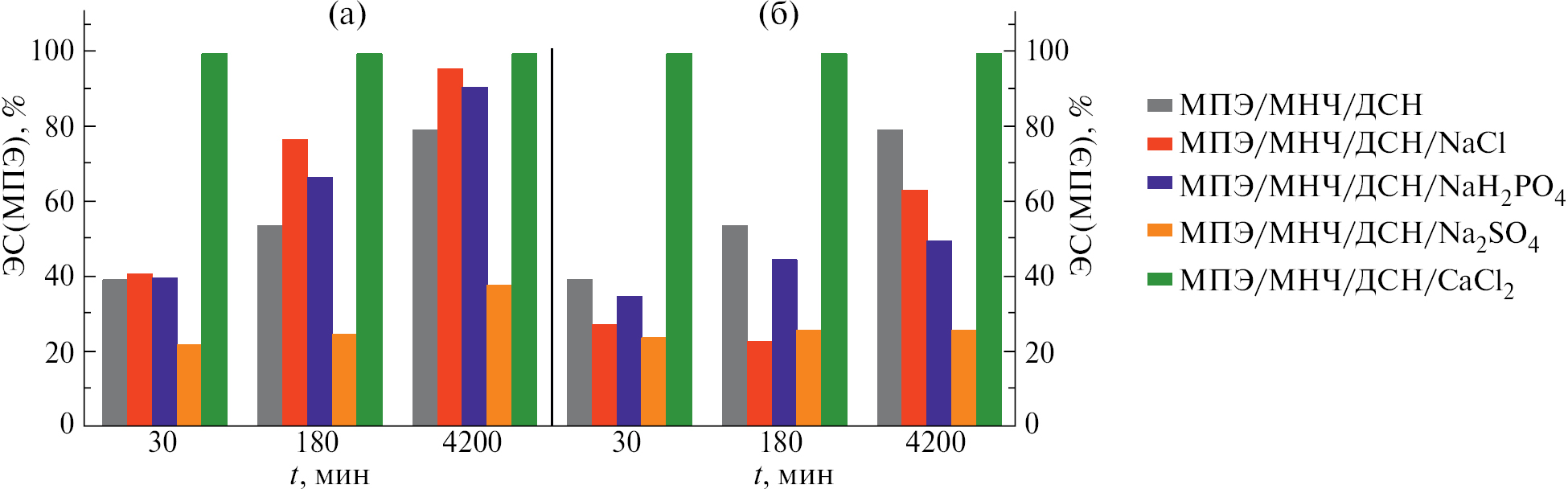 На рис. 4 показаны зависимости эффективности магнитной сепарации МПЭ от длительности предварительной выдержки t при с(МНЧ) = 0.005 г/л (эксперимент 4, табл. 1). Увеличение длительности предварительной выдержки до 4200 минут приводит к росту ЭС(МПЭ) для всех солей кроме Na2SO4. При изученных концентрациях солей наблюдается практически полное удаление МПЭ только в присутствии хлорида кальция. В суспензиях, содержащих соли NaCl, NaH2PO4 в низкой концентрации (10 мМ), эффективность магнитной седиментации МПЭ выше, чем в суспензии без растворенных солей (рис. 4а). Однако повышение концентрации этих солей от 10 мМ до 100 мМ (рис. 4б) приводит к снижению эффективности магнитной седиментации по сравнению с суспензией без соли. Эффективность магнитной сепарации МПЭ в водной среде, содержащей Na2SO4, ниже, чем в средах с другими солевыми добавками. Концентрация магнитных частиц 0.005 г/л является недостаточной для эффективного удаления микропластика из водных суспензий, содержащих соли и ПАВ. По нашим данным, минимальная концентрация МНЧ, необходимая для сепарации МПЭ, составляет 0.01 г/л.