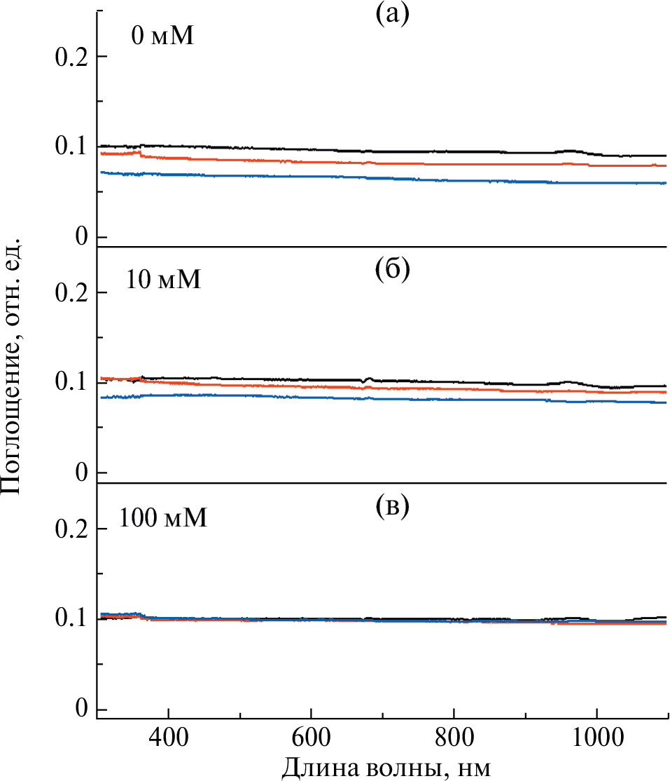 Рис. 9. Оптические спектры поглощения, полученные методом УФ-спектрофотометрии, для водных суспензий состава МПЭ/ДСН/NaCl при концентрации с(NaCl) = 0 мМ (а), 10 мМ (б), 100 мМ (в). Длительность предварительной агрегации составляла 0 минут (черный), 30 минут (красный), 300 минут (синий), с(ДСН) = 3 мМ.