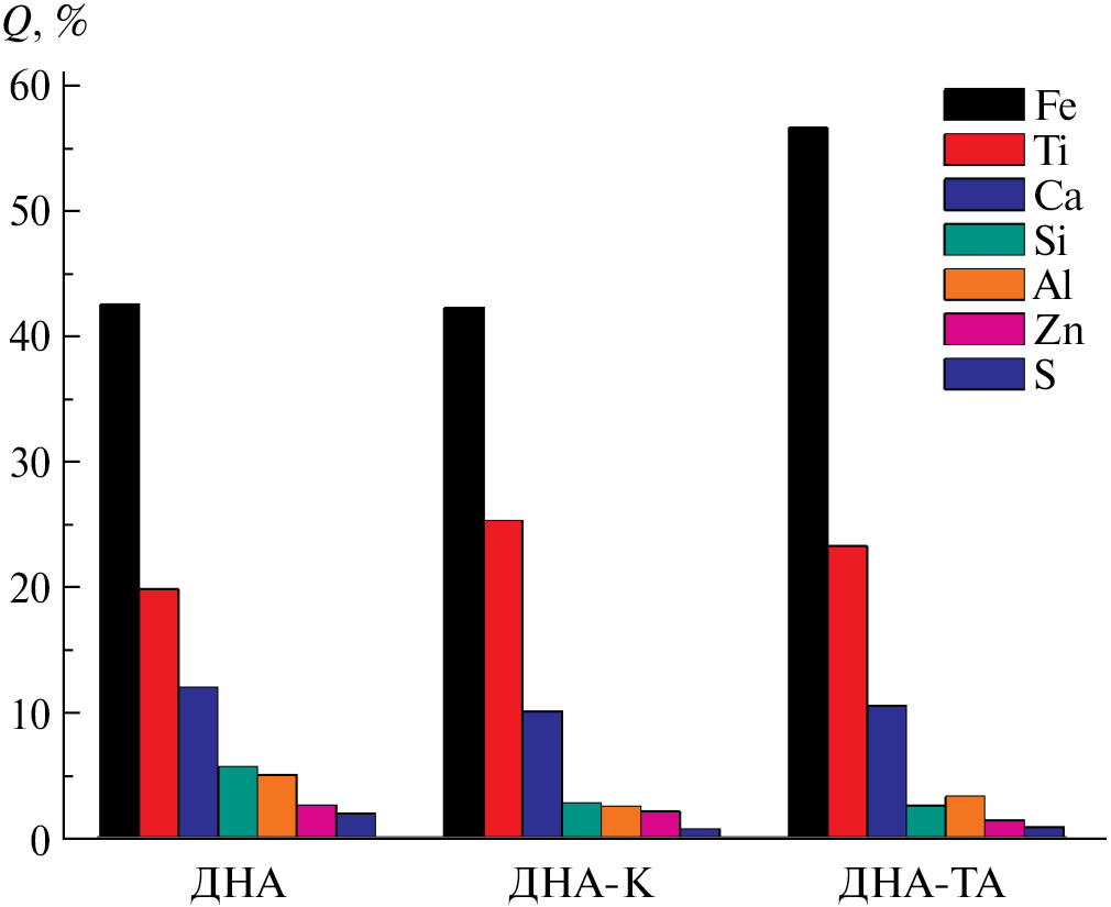Результаты энергодисперсионного рентгенофлуоресцентного анализа показали (рис. 2), что дополнительная обработка исходного порошка детонационного наноалмаза приводит к увеличению относительного содержания таких элементов, как железо (особенно в случае ДНА-ТА) и титан вследствие частичного удаления с поверхности частиц ДНА, по-видимому, более растворимых в кислотах и щелочи компонентов: кальция, кремния, алюминия и т. д. Более высокое суммарное содержание элементов железа и титана в образце ДНА-ТА по сравнению с ДНА-К может свидетельствовать о более эффективной в общем случае термоаммиачной обработки очистке. При этом наблюдаемое наименьшее содержание цинка и серы для образца ДНА-ТА вполне согласуется с результатами РФА.