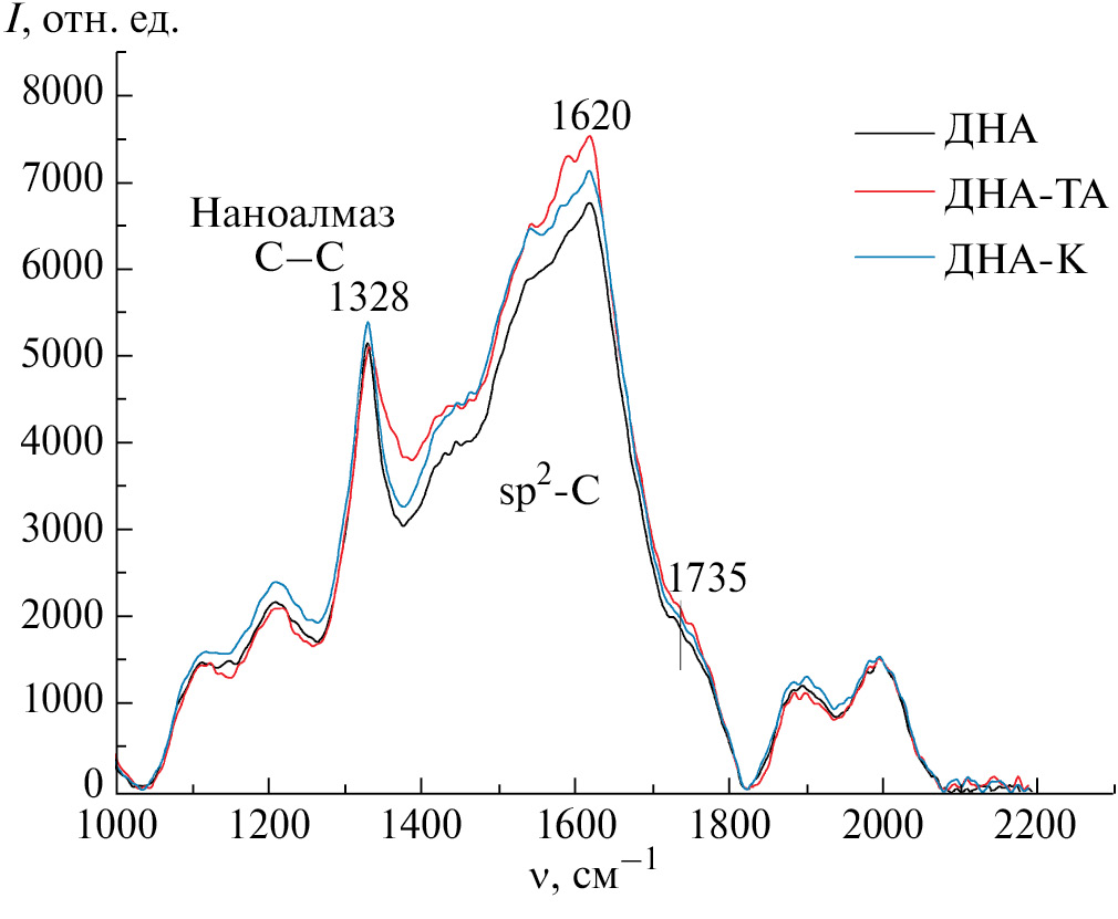 Как видно из рис. 4, в спектрах КРС помимо пика наноалмаза 1328 см–1 [32], присутствует широкий асимметричный пик с максимумом при 1620 см–1, соответствующий углероду в sp2-гибридизации. При разложении этого пика (на примере ДНА-К, рис. П1 Приложения) для всех образцов наблюдаются D- и G‑линии графита. Следует отметить, что появление D‑линии графита в КР‑спектре ДНА в литературе связывают с образованием вокруг алмазного ядра оболочек со структурой типа «onion-like» carbon («луковичной» оболочкой), на которой располагаются вкрапления графитоподобной фазы [33, 34]. Большая интенсивность D‑линии графита в спектре ДНА-ТА по сравнению с исходным ДНА и ДНА-К (рис. 4), по всей видимости, характеризует меньшую упорядоченность и большую дефектность графитоподобной фазы в ДНА-ТА. Это, вероятно, свидетельствует о более эффективном удалении примесей, содержащихся в этой фазе, с поверхности частиц ДНА-ТА, что подтверждает вышеописанные результаты. Следует также отметить, что в КР спектрах всех порошков ДНА наблюдается пик при 1735 см–1, характеризующий колебания в C=О связи.