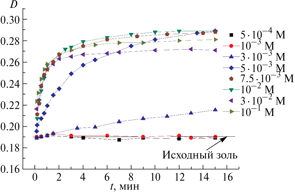 Для изучения процесса коагуляции золей ДНА были использованы методы турбидиметрии (детально методика эксперимента описана в [29]) с использованием фотоэлектрокалориметра КФК-3-01 (оптический путь 50 мм, длина волны света 380 нм) и динамического рассеяния света. Измерения оптической плотности проводили в течение 15 минут с момента добавления электролита к золю, размера частиц по истечении 20 минут после создания системы.