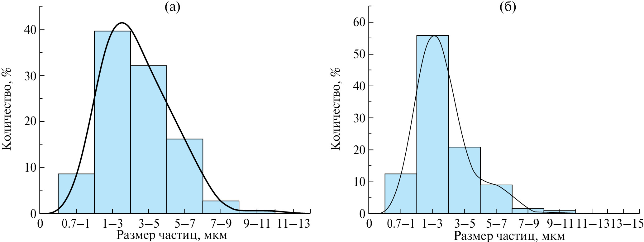 Рис. 2. Распределение частиц по размерам для частиц ПССт (а) и сополимера П(ССт-со-ВА) (б).