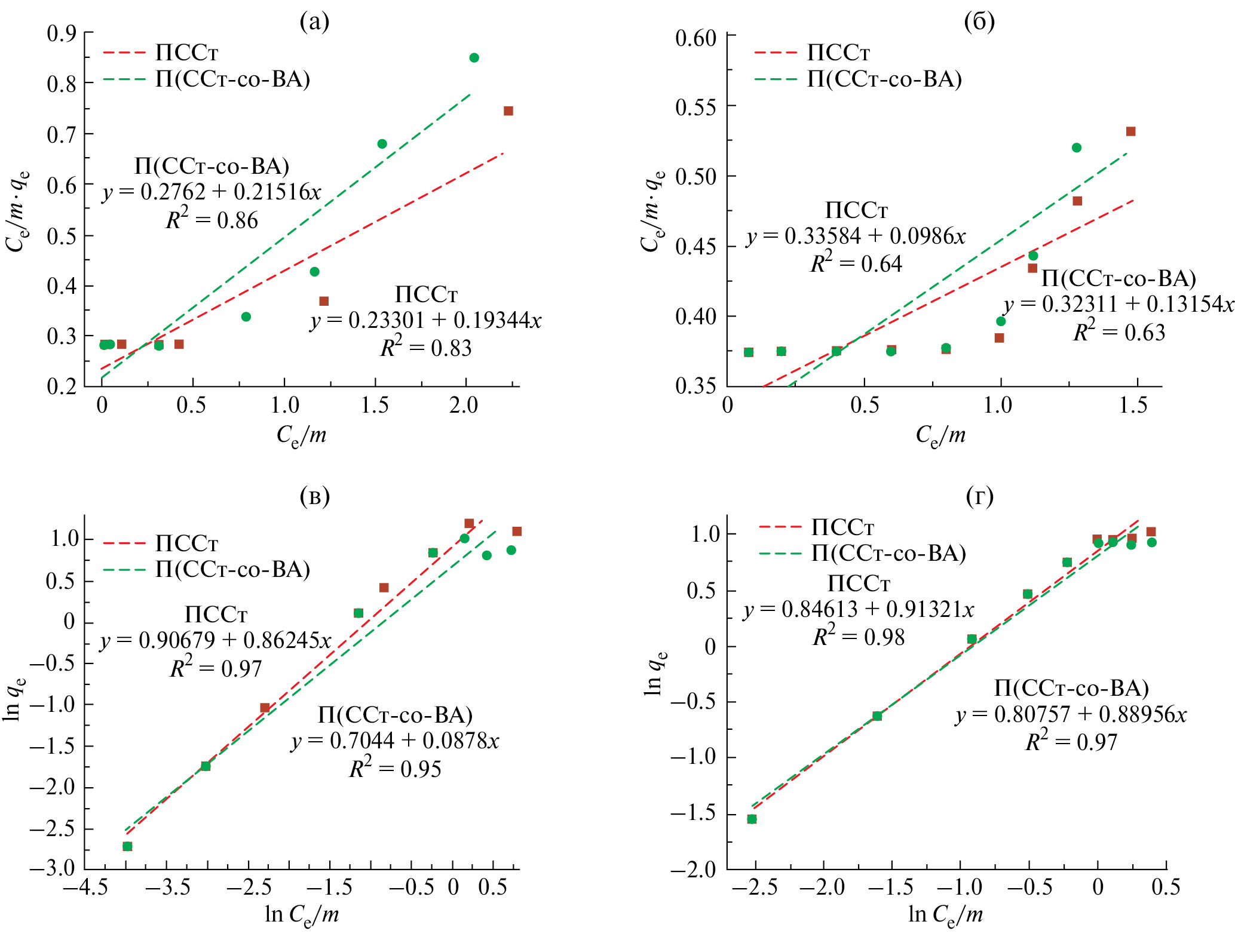 Рис. 8. Линейные корреляции изотерм Ленгмюра для фуксина (а) и метиленового синего (б); линейные корреляции изотерм Фрейндлиха для фуксина (в) и метиленового синего (г)