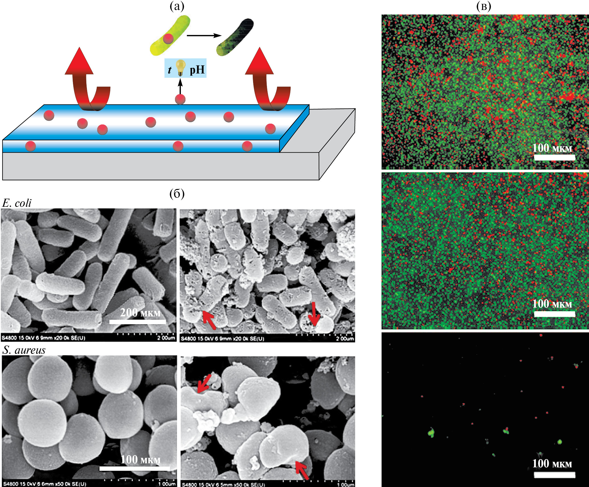 Рис. 5. а – схематическое изображение механизма действия интеллектуального антибактериального покрытия; б – электронные микрофотографии E. coli и S. aureus, культивируемых с углеродными капсулами, модифицированными полиэтиленгликолем и легированными азотом с облучением лазером 808 нм и без него. Воспроизведено из работы [138], с разрешения Американского химического общества, 2018 г.; в – изображения жизнеспособных клеток (зеленые) и мертвых бактерий (красные) S. aureus, полученные с помощью конфокальной микроскопии 3D-нанопористой поверхности без покрытия, 3D-нанопористой поверхности с покрытием дубильной кислотой, 3D-нанопористой поверхности с покрытием дубильной кислотой и гентамицина соотвественно. Воспроизведено из работы [129], с разрешения Американского химического общества, 2015 г.
