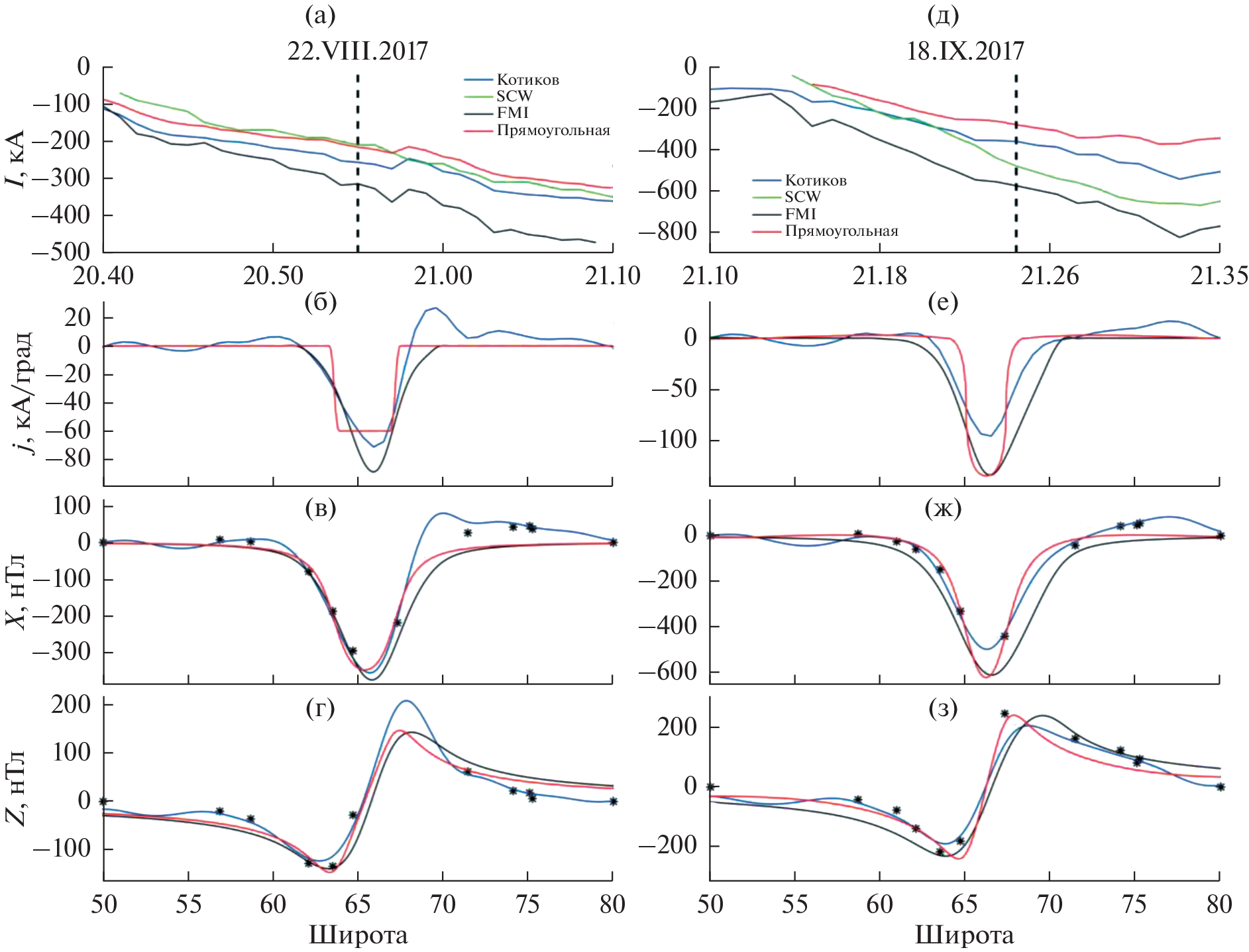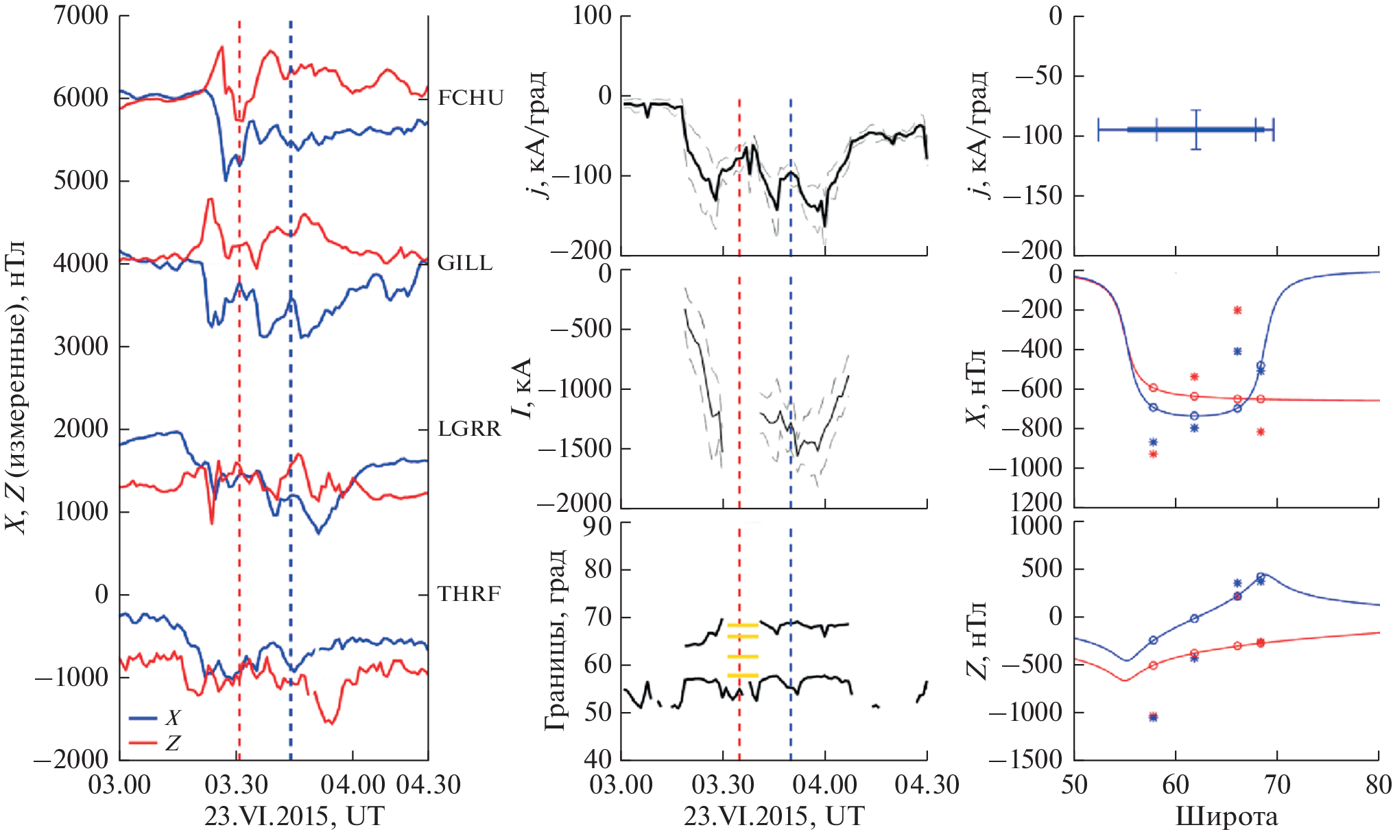 Продолжается разработка простой “прямоугольной” модели западного аврорального электроджета, основанной на наблюдениях магнитного поля вдоль разреженной меридиональной цепи станций в полярной зоне. Модель имеет три параметра: две границы и постоянную плотность электрического тока. Работа модели показана на примере суббурь, наблюдаемых на цепочке станций CARISMA (англ. Canadian Array for Realtime Investigations of Magnetic Activity). Был введен дополнительный параметр, позволяющий менять меридиональный профиль тока от прямоугольного к колоколообразному, но его влияние на работу модели оказалось слабым. В заключение проведено сравнение оценок полной силы электроджета, полученных по этой модели, с оценками суббуревого токового клина, полученными по среднеширотным станциям. Обе оценки имеют схожие амплитуды и изменяются согласованно в течение развития взрывной фазы суббури. Величины тока в определенные моменты времени могут различаться в два раза, но схожие различия наблюдаются и для других моделей западного аврорального электроджета. Последнее предполагает, что реальная геометрия тока электроджета и тока клина могут значительно отличаться от используемых относительно простых моделей.