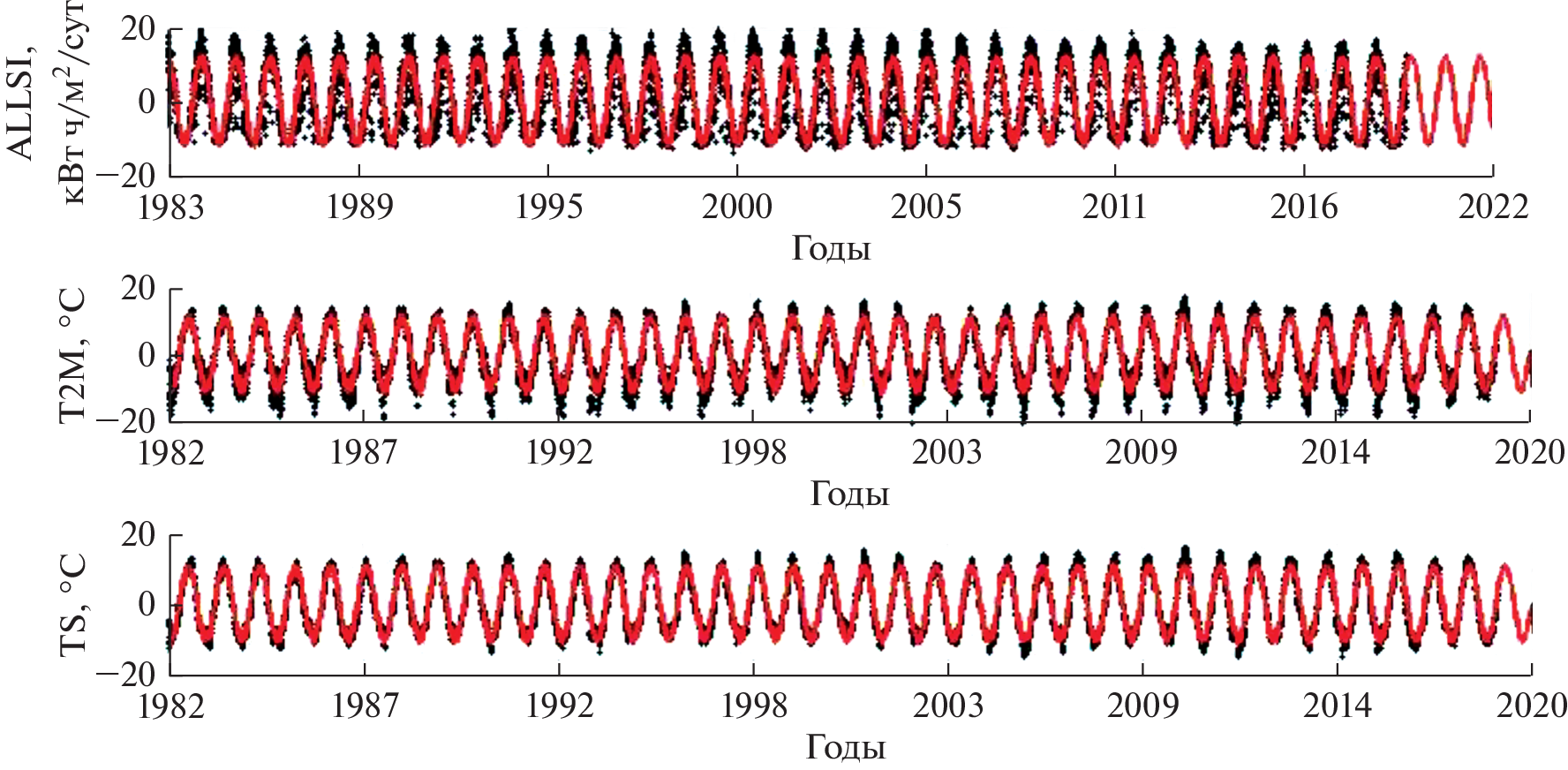 A range of issues related to the results of the analysis of some meteorological and solar series of satellite observations in the Kara-Dag area (Crimea) is considered. A qualitative and quantitative picture of changes in the total insolation falling on the Earth’s surface, air temperature at a height of 2 m, and the Earth’s surface temperature in Kara-Dag over the past 38 years is presented. A numerical model has been constructed that makes it possible to predict the most powerful fluctuation with a period of 1 year in the analyzed data. The following methods were used in the work: the method of wavelet analysis, statistical methods for extracting Gaussian and non-Gaussian noise, an iterative method for constructing and estimating the accuracy of model approximations. Coherent variations in the analyzed and some global geodynamic and solar time series were established using two-channel autoregressive analysis. A qualitative characteristic of the process of changing the main variations in the analyzed time series was obtained using the analysis of phase trajectories on the Poincaré plane.